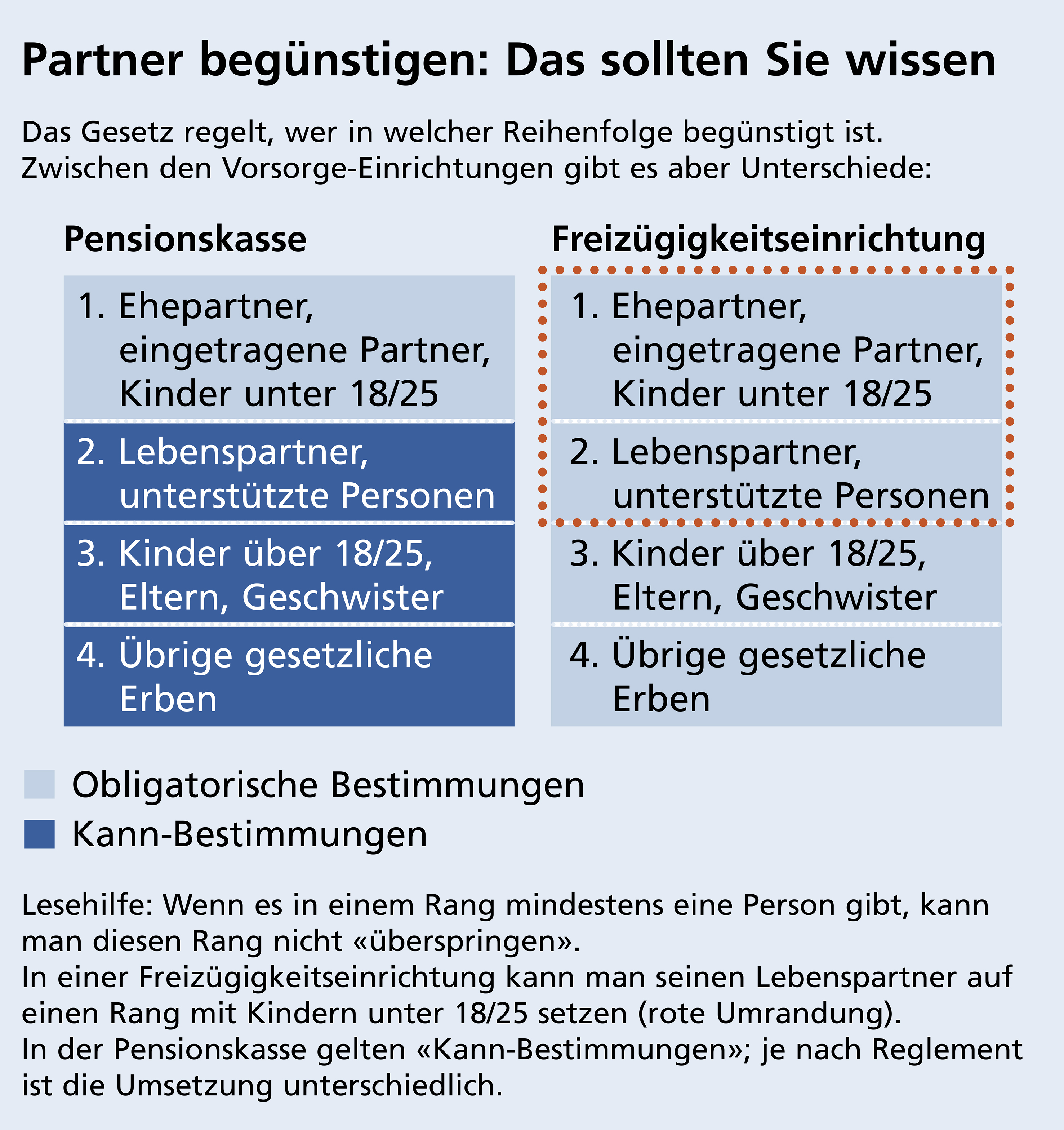 Unter Umständen dürfen Pensionskassen Todesfallleistungen ausrichten. Doch selbst wenn alle Voraussetzungen erfüllt sind, genügt es oft nicht, wenn man den Lebenspartner zum Beispiel im Testament als Alleinerben einsetzt. Denn Guthaben in der Pensionskasse, der Freizügig keit und der Säule 3a sind nicht im Erbrecht geregelt, sondern im Vorsorgerecht – und das ist komplex. In der Freizügigkeitseinrichtung kann man seinen Lebenspartner zum Beispiel mit Kindern unter 18 bzw. 25 Jahren auf einen Rang setzen. Für Pensionskassen gelten «Kann-Bestimmungen» – dort ist der Spielraum im Reglement definiert (vgl. Grafik).