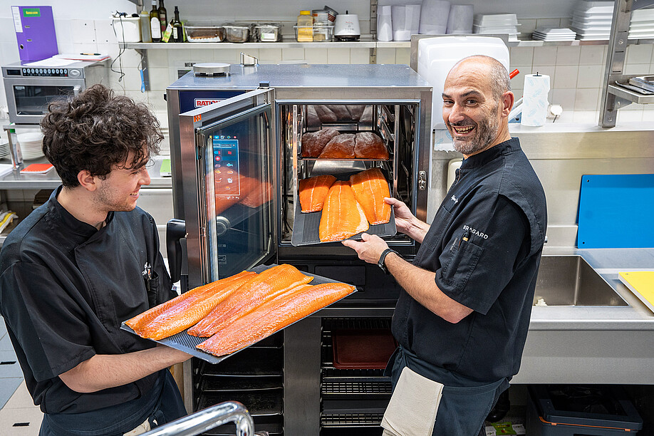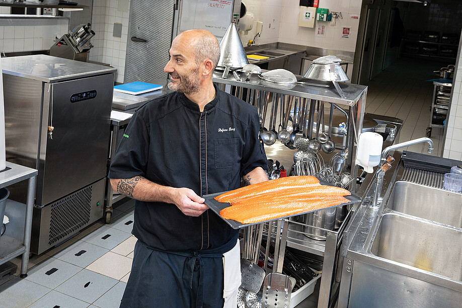 Qualität und Frische stehen bei Stefano Peng natürlich auch bei Fisch und Krustentieren ganz oben auf der Liste seiner Ansprüche. Er setzt deshalb auf die Produkte von Dyhrberg aus Balsthal. «Gerade bei Fisch und Meeresfrüchten sind die Qualität und die Einhaltung der Kühlkette enorm wichtig», erklärt er. Für ihn sind diese Anforderungen bei Produkten der Dyhrberg AG garantiert. Besonders beliebt bei den Hotelgästen ist der Lachs mit Blinis und einer Dill-Senf-Sauce auf dem Frühstücksbuffet. Geliefert wird er von Dyhrberg, geräuchert in der Hotelküche.