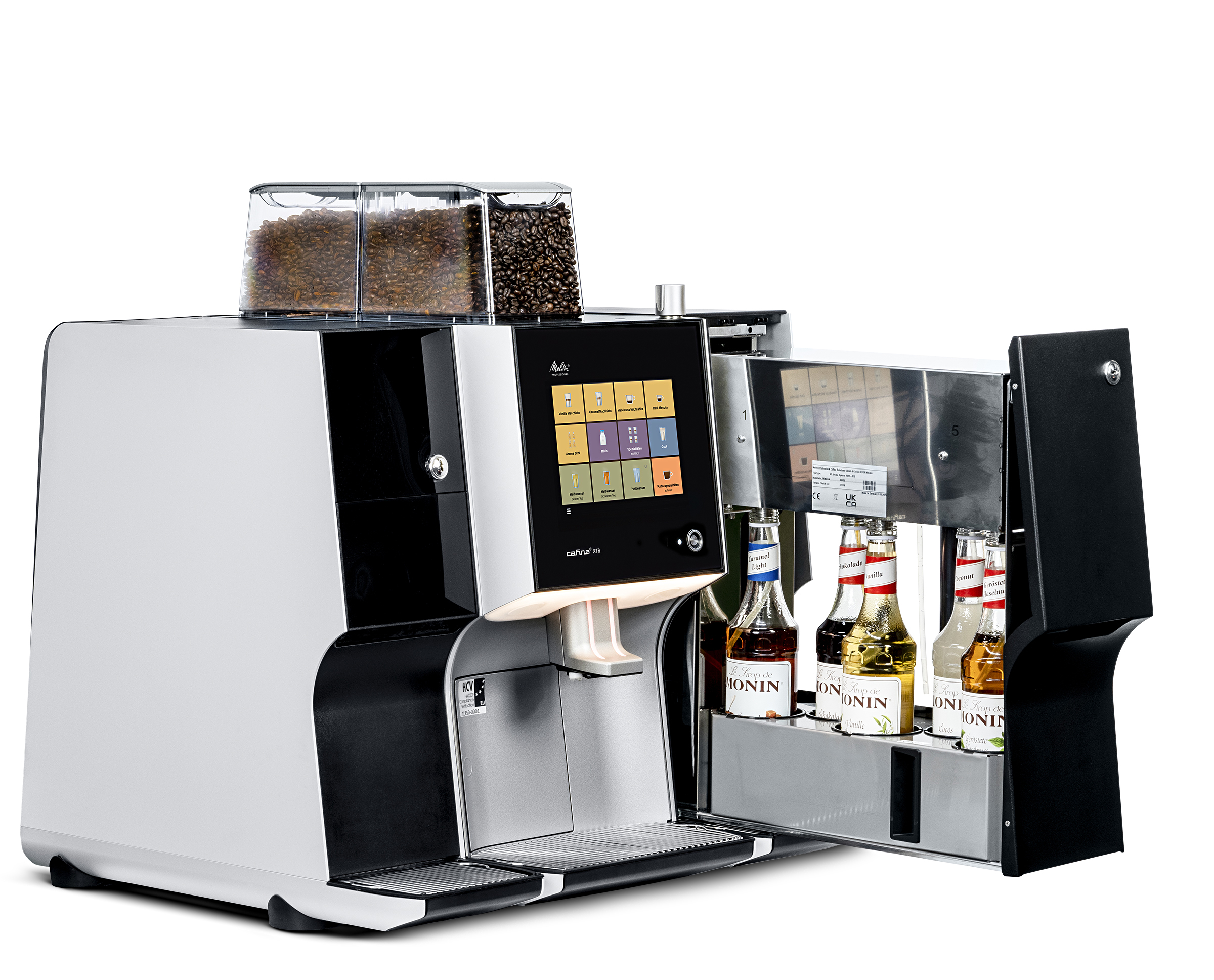 Vanille, Zimt, Salty Caramel, Basilikum, Amaretto? Zahlreiche Sirup-Aromen erweitern das Getränke-Angebot. Für Kaffeespezialitäten, Milchshakes, Kaffee-, Kakao- oder Milchschaum-Cocktails mit und ohne Alkohol oder auch Eistee erschliesst das Melitta Cafina XT-Aroma System neue Mix-Ideen auf Knopfdruck. Fünf Sirup- oder Getränke-Flaschen lassen sich mit dem schlanken Modul an die Kaffeevollautomaten XT5 bis XT8 von Melitta Professional anbinden.
