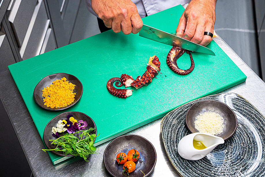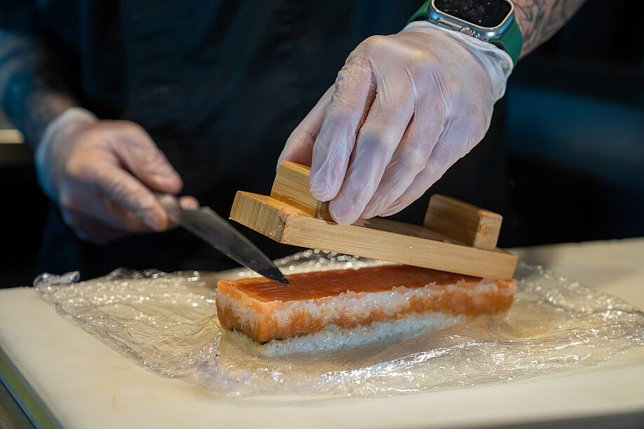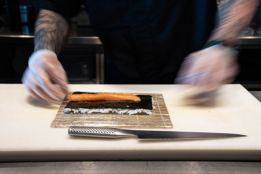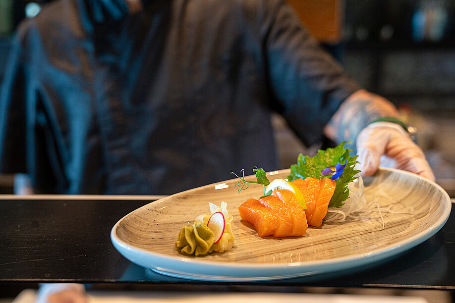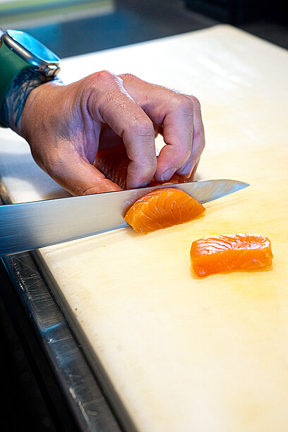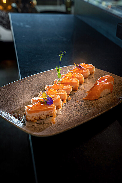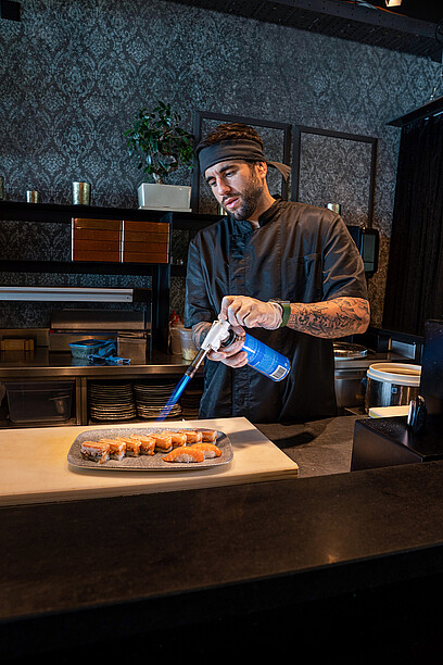 In die Höhe geht es im Blu Restaurant & Lounge für einen Ausflug ins Land des Lächelns: Im ersten Stock mit der grandiosen Aussicht auf den Lago Maggiore ist der stilvoll gestaltete Sushi & Natural-Bereich untergebracht. Wer es exotisch mag, ist hier also bestens aufgehoben. Qualifizierte Köche verwöhnen den Gast mit viel Liebe und Sorgfalt mit Sushi, Sashimi & Co. Fernöstlicher Zauber vom Feinsten! Dass über den ganzen Betrieb hinweg sämtliche Produkte frisch zubereitet werden, ist für Executive Chef und Küchenchef Davide Asietti oberstes Gebot. Wenn es um die Produkte-Qualität geht, stellt er höchste Ansprüche. Das gilt nicht nur für den Sushi-Bereich, sondern auch für alle integrierten Bereiche. Was Fisch und Krustentiere anbelangt, setzt er deshalb auf die Produkte der Lachsräucherei Dyhrberg AG aus Balsthal. «Besonders bei Sushi ist die Qualität und die Einhaltung der Kühlkette enorm wichtig», erklärt Davide Asietti gegenüber GOURMET. Für ihn sind diese Anforderungen bei den Produkten der Dyhrberg AG vollumfänglich gewährleistet. Die Kooperation mit der ersten Lachsräucherei der Schweiz bringt er kurz und bündig auf einen Nenner: «Gute Qualität, guter Service.» Einmal pro Woche liefert ihm Dyhrberg den tiefgekühlten Lachs direkt in die Küche.