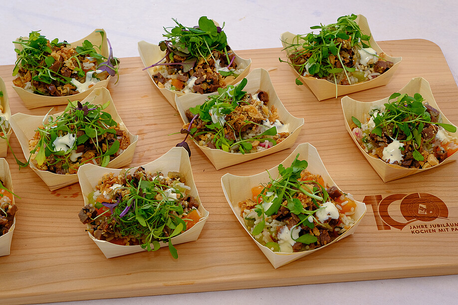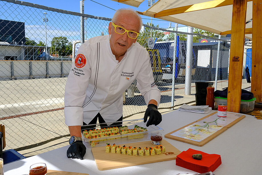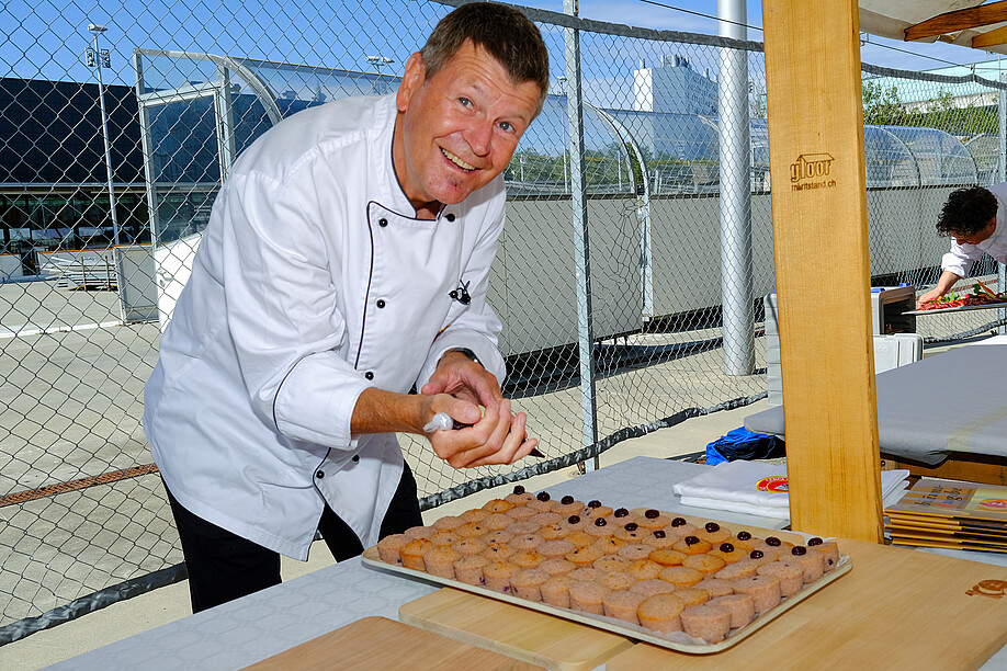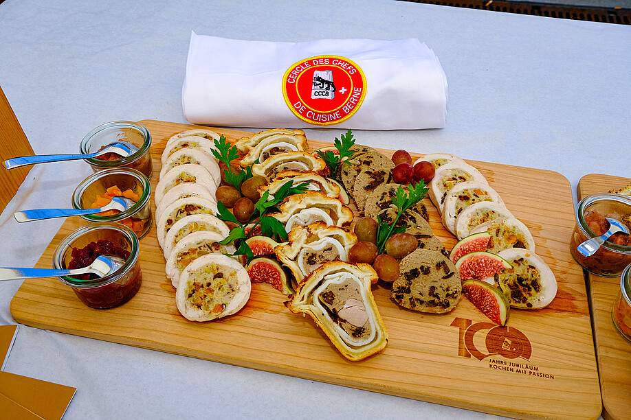 Mitte September lud der Cercle des Chefs de Cuisine Bern (CCCB) die Bevölkerung vor der PostFinance-Arena in Bern zu einem 100-Meter-Buffet. 100 Köchinnen und Köche boten auf je einem Quadratmeter pikante und süsse Köstlichkeiten. Mousse, Terrinen, Pasteten – wunderschön angerichtet. Feinster Fingerfood zum Degustieren aus 100 verschiedenen Berner Gastrobetrieben. Dazu süsse Verführungen von Patissier Rolf Mürner. Einfach grandios. Die Gäste waren begeistert – von der Qualität und von der Grosszügigkeit des Angebots, das letztlich auch als grosses Merci des CCCB an die Bevölkerung galt.