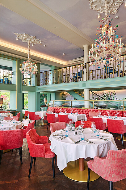 Für die Innenarchitektin Jasmin Grego ist es auch ein Spiel mit der Vergangenheit des Schlosses, waren doch Bildtapeten in seiner Entstehungsphase sehr in Mode. «Es ist eine Illusion, ein Trompe-l’Œil, das einen grösseren Raumeffekt schaffen soll. Das Restaurant verschmilzt mit der Umgebung und dem Berg», sagt sie. Zudem sei es eine Anlehnung an einen Schweizer Gartenpavillon, deshalb habe man auf exotische Darstellungen verzichtet und sich auf heimische Flora und Fauna beschränkt. Blau- und Grüntöne mit goldenen Zierrändern dominieren im Restaurant. Schlichte Eleganz steuern die neuen Sessel und Bänke bei. Die floralen Lüster, Unikate aus Murano-Glas, integrieren sich harmonisch in den Raum.