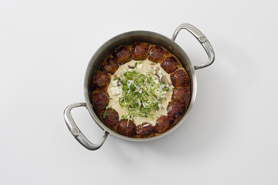 Glasierte Keule mit Entenleber und Berner Alpenkräutern.
