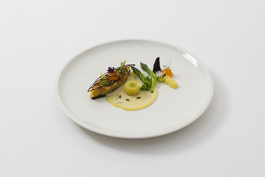 Morchelragout mit Zuckererbsen, Spargeln und eleganter Schweizerweinreduktion.
