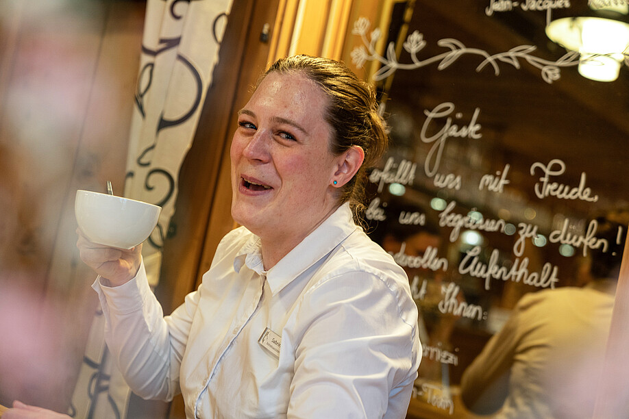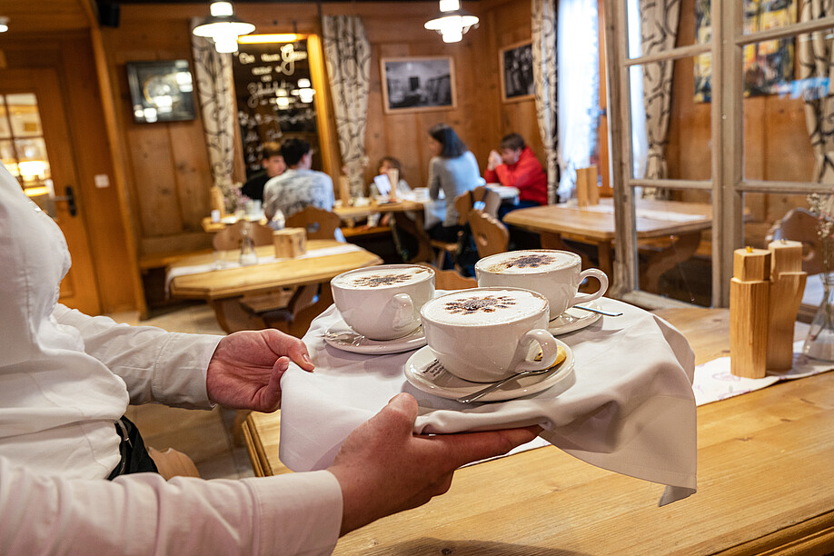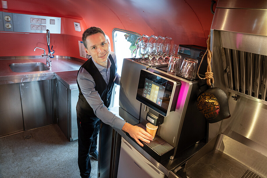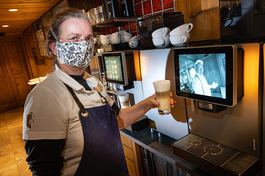 Das alles steckt in einer Franke Kaffeemaschine. In der Gaststube des Kemmeriboden Bad stehen zwei Franke A800 FoamMaster Kaffeevollautomaten. Die reichen aus, um einem Kaffeekonsum von bis zu 200 Tassen pro Tag gerecht zu werden. Im Sommer kommt noch eine A800 HD dazu. Im Foodtruck steht eine A600 FM. Dieses Setup braucht es, um die Spitzen während des Hochbetriebs zu brechen. Die Kaffeemaschinen sind kombiniert mit dem FoamMaster. Er liefert den Schaum, den Stevens Bockor, Restaurationsleiter im Kemmeriboden Bad, glücklich macht: auf dem Cappuccino, dem Ristretto, dem Latte Macchiato. Der FoamMaster kann auch eine erfrischende Erdbeer-Milch oder kalten Milchschaum liefern. Dank ihm lassen sich Konsistenz und Dichte des Schaums varieren. Es ermöglicht auch kunstvolle Schichtungen – auch dann, wenn besonders grosser Andrang herrscht.