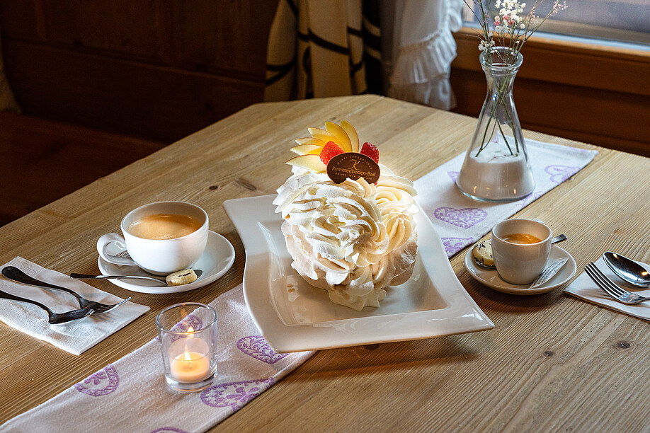 Das Kemmeriboden Bad steckt voller Geschichten. Herzerwärmende wie dramatische. Es steckt aber auch voller Traditionen. Beides vermögen die Gastgeber Reto und Alexandra Invernizzi zu bewahren und in vielen kleinen Details zu erzählen: Im Hochzeitsschrank der Ur-Urgrosseltern etwa, der heute das Zimmer im Dachgeschoss des Stöcklis schmückt. Oder im Rundweg «Kemmeriboden Bankgeheimnis», welcher an acht Stationen Anekdoten rund um das Anwesen erzählt. Aber auch in jeder Kreation aus der Küche, ganz besonders in der «Merängge».