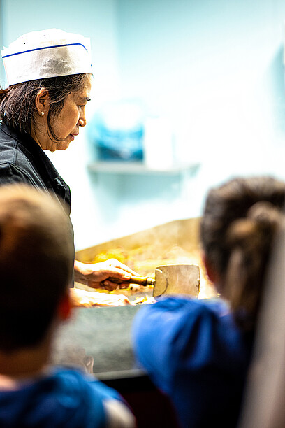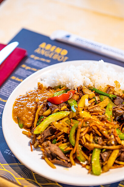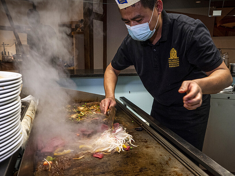 Mongolisches Barbecue – das geht so: Man schöpft nach Lust und Laune vom Buffet mit einer grosszügigen und vielfältigen Auswahl an rohen Produkten und türmt also beispielsweise Kefen, Zucchetti, indischen Käse, Tofu, Poulet oder Crevetten auf den Teller. Profis stapeln höher als Anfänger, weil sie den Volumenverlust beim Grillieren bereits kennen. Dann mariniert man mit Soja-Sauce, Bouillon oder Knoblauch-Öl und gibt die Köstlichkeiten an der Grill-Theke ab. Eine erfahrene Barbecue-Spezialistin schiebt die Zutaten auf einem heissen Herd hin und her. Es brutzelt, zischt und dampft. Bis zu fünf Gerichte werden gleichzeitig zubereitet. Dann richtet sie das Grillierte auf sauberen Tellern an, die Gäste schmecken mit Barbecue- oder Pfeffer-Saucen nochmals ab und dann heisst es nur noch: Geniessen!