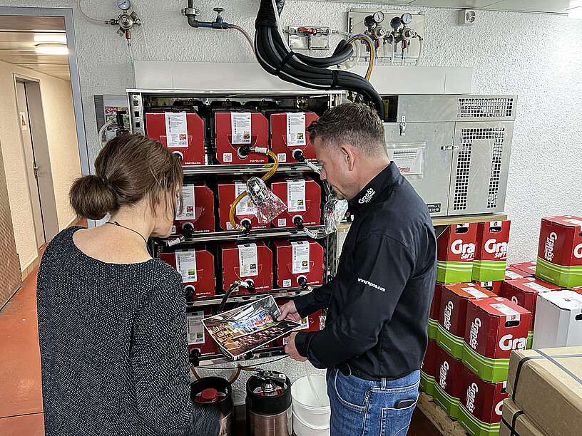 Konkret: mit einem Postmix-Getränkeausschank im Servicebereich, aus dem Grapos-Softdrinks sprudeln. Frisch, spritzig, cool. Dahinter steckt ein ausgeklügeltes System. Die Leitungen führen in den Keller, wo sich im Dschingis Bern-Liebefeld auf rund 1,5 Quadratmetern zwölf Bag-in-Boxen mit den Grapos-Aroma-Konzentraten stapeln. «Eine Zehn-Kilo-Box ergibt rund 65 bis 70 Liter Softgetränke. Von jedem Geschmack sind zwei Boxen durch einen Vakuum-Umschalter zusammengeschlossen. Dieser verhindert ein Leerlaufen der Konzentrat-Leitungen. lst kein Konzentrat mehr in der Box, schaltet das System automatisch auf die nächste Box um», erklärt Rolf Dütsch, Mitinhaber der Grapos AG. So einfach ist das.