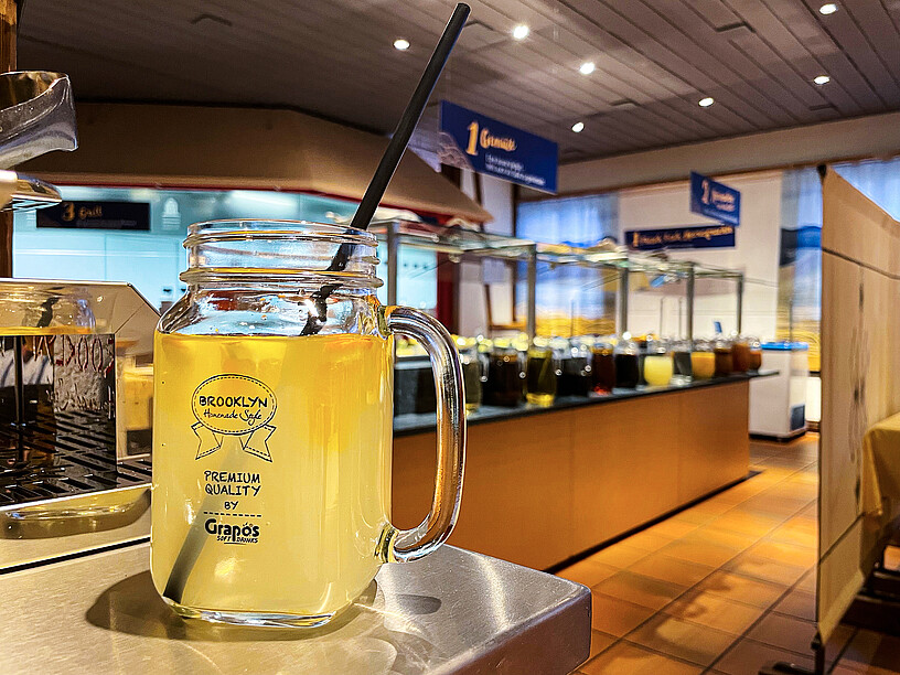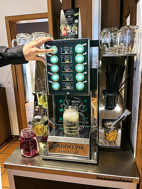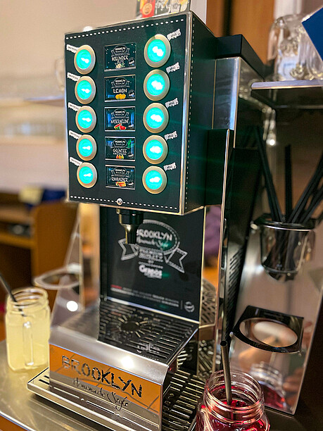 Nun haben wir aber noch gar nicht über Brooklyn gesprochen, das In-Viertel aus New York, trendig, cool, «The place to go», das Grapos zur Entwicklung der Brooklyn-Ausschankanlage inspirierte. Ein Streetfood-Konzept, das sich auch im Dschingis gut macht. Die Bag-In-Boxen mit den Konzentraten sind im Unterschrank ein gut gehütetes Geheimnis, und oben sprudeln hippe Drinks wie Wassermelone-, Grüntee, Kaktusfeige- oder Rhabarber-Limonade aus dem Hahnen. Dazu gibt’s in bester Cocktail-Manier frische Minze-Blätter oder Zitronen-Schnitze zum Garnieren. Und das Coolste daran: Die Gäste können sich selbst bedienen, also nicht alle Gäste, sondern nur jene, die ein «All you can drink» bestellen, das passt zum Bestseller «All you can eat» — und natürlich ist das Refill-Angebot auch ins «All Inclusive»-Angebot des Dschingis integriert, mit dem man so lange geniessen kann, wie es einem wohl bekommt.