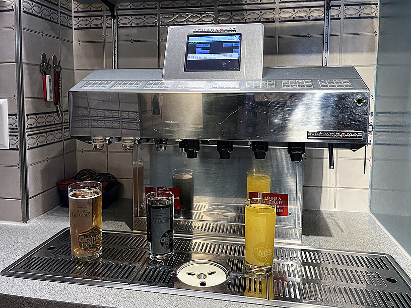 Die mit Pressluft betriebene Vakuumpumpe leitet die Aroma-Konzentrate anschliessend mit dem im Karbonator gekühlten hauseigenen Wasser zu den Ausschankhahnen hoch, wo das Getränk A la Minute gemischt wird – und fertig ist das erfrischende Softgetränk – Grapos-Cola, Grapos-Zitrone, sogar Rivella, und zwar das Echte. Denn mit Rivella pflegen die Geschäftsführer der Grapos Schweiz AG eine langjährige Partnerschaft. Deshalb sprudelt auch das Schweizer Kultgetränk direkt ab Zapfhahn in die Gläser der Gäste.