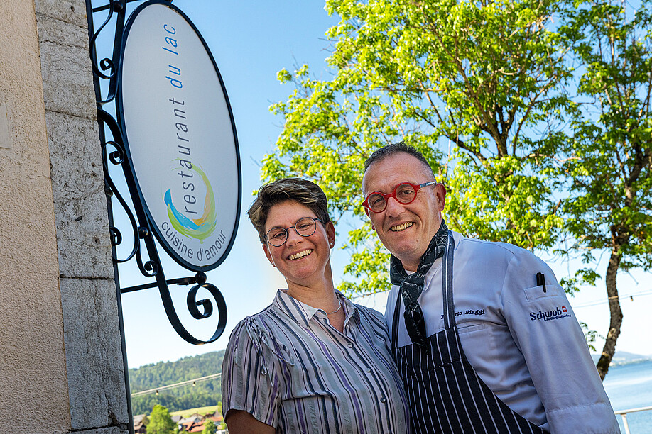 Der Lac de Joux ist eine verborgene Schönheit im gleichnamigen Vallée de Joux, ein mit Wald, Schilf und schroffen Felsen gesäumter See, der seine Besucherinnen und Besucher vielerorts auf Abstand hält, andernorts ungewohnt viel Nähe zulässt. Die Häuser der wenigen Dörfer schmiegen sich an ihn und wetteifern um die beste Seesicht. An seinem Nordufer, wo sich der Lac de Joux und der kleinere Lac Brenet am nächsten sind, liegt das Dorf Le Pont. Hier führen Sylviane und Roberto Biaggi das exquisite Gilde-Restaurant du Lac. Unscheinbar auf den ersten Blick. Aber bereits der Gilde-Banner am Terrasseneingang nimmt Roberto Biaggi das Versprechen ab, in der Küche Ausserordentliches zu leisten, und auch das Label «Fischküche mit Auszeichnung» von der «Tafelgesellschaft zum Goldenen Fisch» ist Würdigung und Herausforderung zugleich.