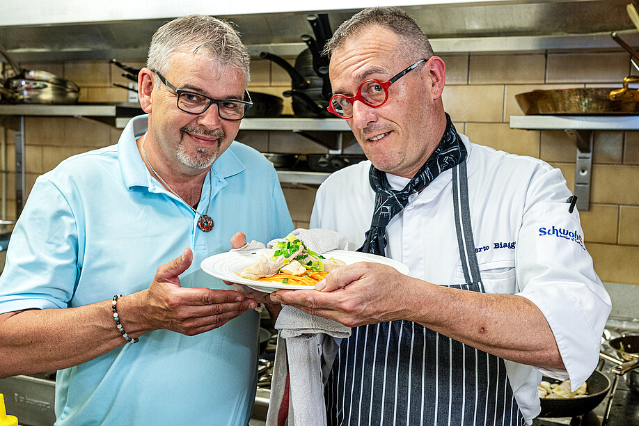 Roberto Biaggis Spezialität lautet: Immer anders, immer neu! Inspirationen liefert nicht etwa der See, auch nicht seine Aufenthalte in Asien oder in den Küchen von Luxusdampfern wie der Queen Elisabeth. Es ist die Dunkelheit der Nacht, die neue und gute Ideen bereithält. «Ja, ich schlafe wenig», lacht er. «Ich bin nie zufrieden mit mir. Etwas lässt sich immer verbessern, und das ist der Antrieb für neue Kreationen, um unseren Gästen eine ausser-ordentlich schöne Zeit bei uns zu schenken.»