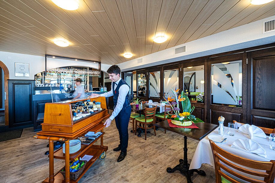 Als Mitglied einer Gilde, die eine etablierte Schweizer Gastronomie fördert, liegt ihm der Nachwuchs besonders am Herzen. 23 Köchinnen und Köche verliessen in 20 Betriebsjahren topausgebildet seine Küche, acht Lernende waren es im Service. Einer von ihnen ist Gonçalo Pereira. Er hat letztes Jahr seine Kochlehre abgeschlossen, absolviert jetzt eine Zusatzlehre im Service. Souverän bedient er die Gäste, aufmerksam, zuvorkommend. «Noch bis vor zwei Jahren hatte ich immer drei Lernende in der Küche, einer pro Lehrjahr. Dieses Jahr habe ich keinen gefunden. Wir sind eine Bergregion, abends ist hier nicht viel los. Die Arbeit in der Küche ist streng. Das passt nicht allen.»