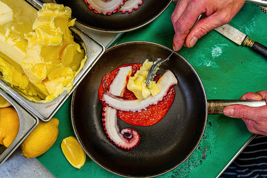 «Mein Konzept ist ganz einfach», sagt Roberto Biaggi gegenüber GOURMET. Er setzt auf Marktfrische aus der Region. Zwei Berufsfischer liefern fangfrische Hechte, Felchen und Eglis aus dem Lac de Joux. Ergänzend kommen Eglis aus dem Wallis auf den Teller, sowie Schweizer Fleisch vom Dorfmetzger. «Rauchlachs beziehe ich bei der Lachsräucherei Dyhrberg AG, ebenso Hummerschwänze, Lachsbäggli und Pulpo.» Letzteren lässt er auf einen Teller gleiten, durchschneidet mit einem scharfen Messer die purpurroten, mit Saugnäpfen gesäumten Fangarme wie Butter. Später kommen sie als Pulpo-Salat auf die Teller jener Gäste, die das Überraschungsmenu wählen.