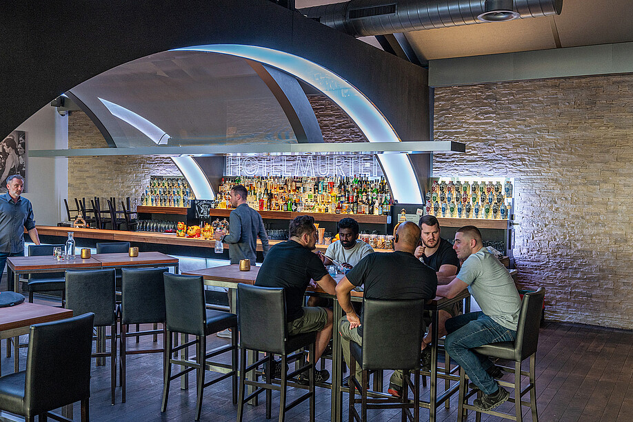 Das Hotel Murten spannt den Bogen also in vielerlei Hinsicht weit auf, auch in Bezug auf das Ambiente. Wer gediegen speisen und ein Drei- oder Viergang-Menu geniessen will, kann das im Restaurantbereich tun. «Hier decken wir mit weissen Tischtüchern stilvoll auf. Wer es ausgelassener mag, geniesst an den Hochtischen in der Bar», erklärt Timo Läderach. Die Karte ist die gleiche. Neonlicht und etwas lautere Musik machen hier zusätzlich Lust auf Drinks beziehungsweise Cocktails, denn die Bar im Hotel Murten ist nicht irgendeine Bar, sondern gehört zu den Top 6 in der Schweiz. Somit gesellt sich das Drei-Sterne-«Landei» aus Murten stolz zur grossartigen Fünf-Sterne-Hotelbar im Suvretta House in St. Moritz oder zu den Hotelbars vom Widder und Storchen in Zürich, die gleichzeitig Aushängeschilder ihrer renommierten Häuser sind.