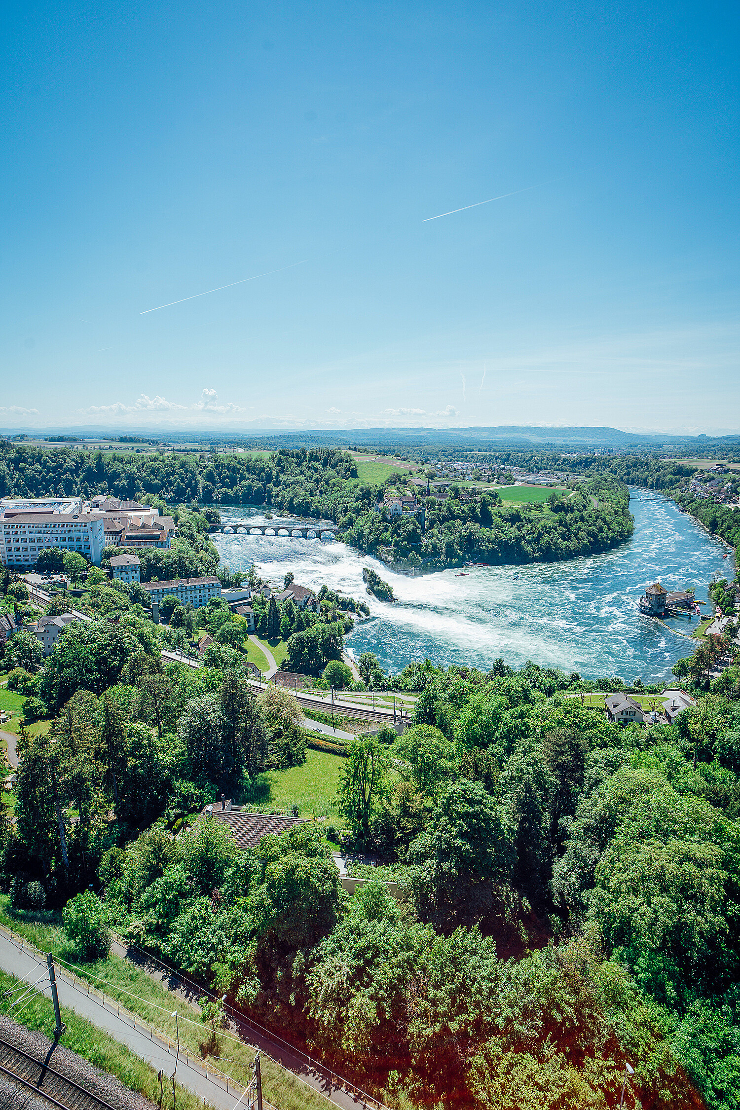 Mit 23 Metern gehört der Rheinfall zu den drei grössten Wasserfällen Europas. Ein eindrückliches Naturschauspiel – erst recht, wenn man es von 136 Metern weiter oben betrachtet. Dafür braucht es seit Juni dieses Jahres nicht einmal einen Helikopter. Vielmehr kann man den Ausblick bei einem feinen Kaffee geniessen. Und dazu auch gleich die Fernsicht bis zu den Alpen oder zur entsprechenden Tageszeit unvergessliche Sonnenuntergänge. Das alles von der RIVI Roof aus, ein Restaurant und eine Bar im 17. Stock in einem der beiden Rhyfall Tower, die mit 60 beziehungsweise 78 Metern Höhe hoch über dem Rheinfall thronen.