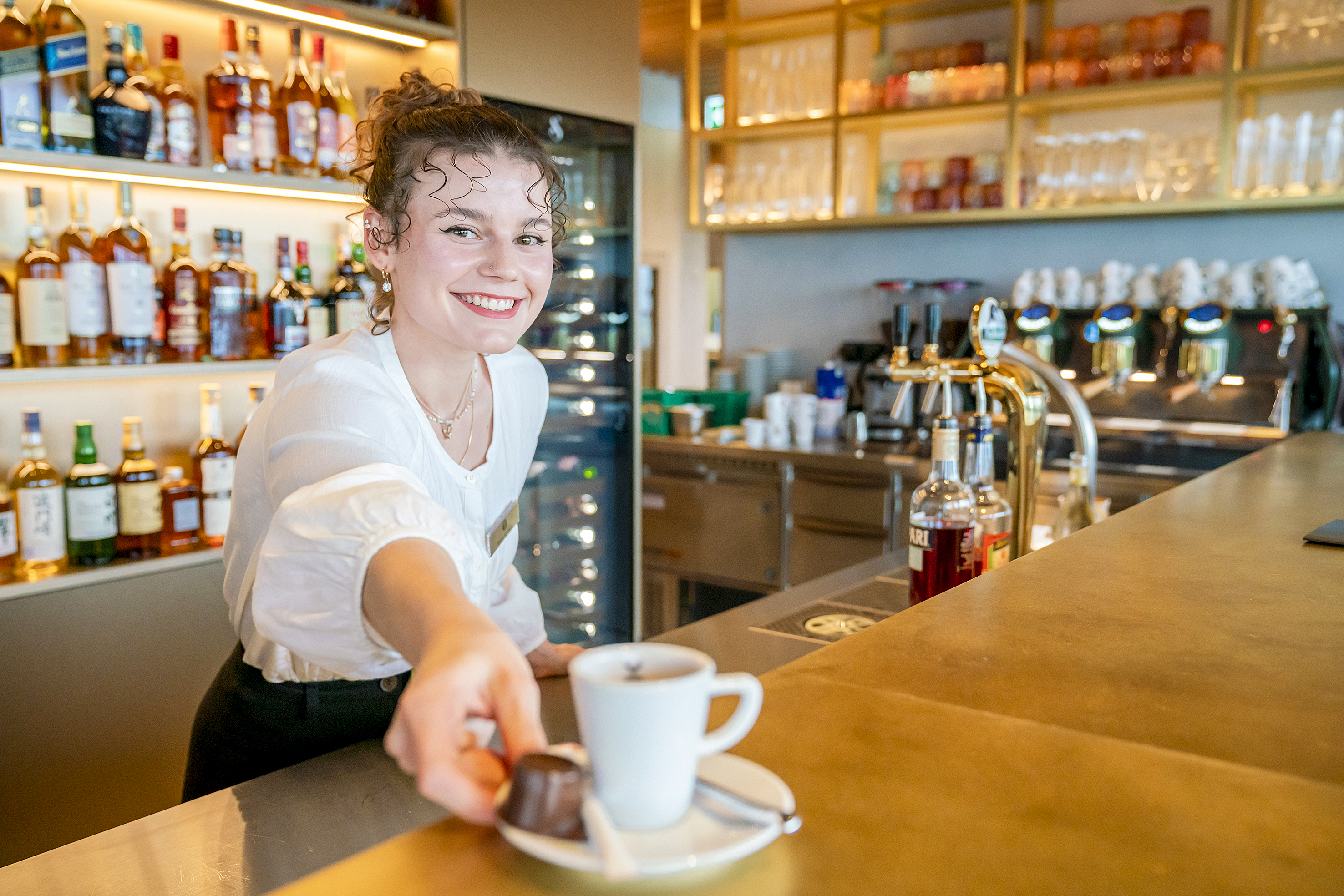Dieses Konzept zieht sich im RIVI Roof bis hin zum Kaffee. Hier startet der Wow-Effekt bereits bei der Kaffeemaschine. Für Geschäftsführer Marco Wahl war klar, dass er eine Kolben-Maschine möchte. «Ich will, dass auch der Kaffee zum Erlebnis wird, dass wir hier echtes Kaffee-Handwerk zelebrieren.» An der Igeho machte er sich auf die Suche nach der passenden Lösung, besuchte Anbieter für Anbieter. «Bei Rex-Royal stand ich dann plötzlich vor einer Maschine, die nicht nur vom Konzept, sondern auch von der Optik her perfekt ins RIVI Roof passt.»