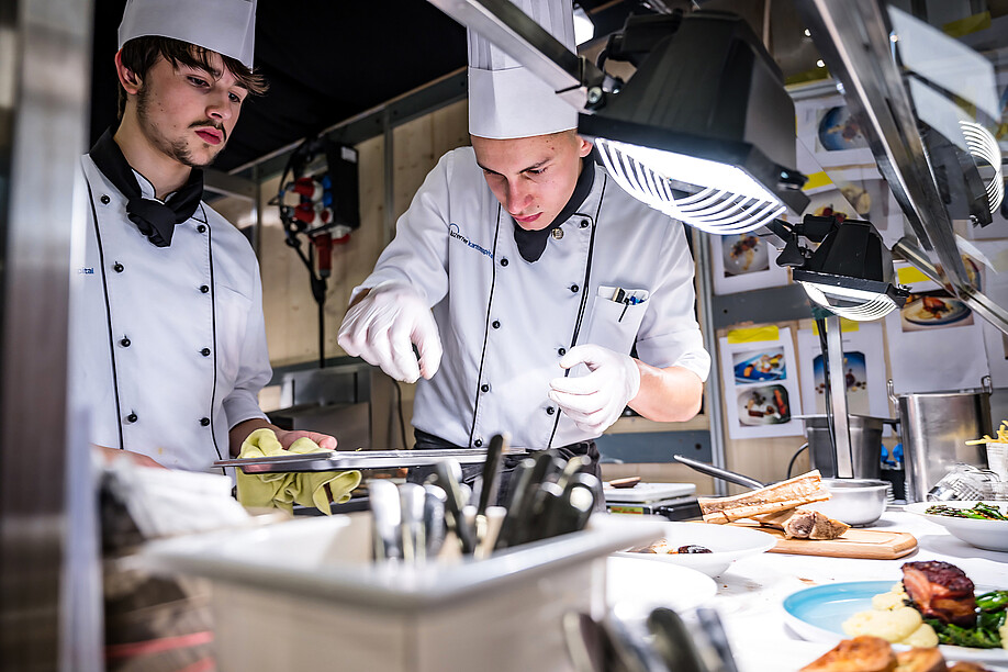 Täglich kochten 15 Lernende für die Gäste im Restaurant Dyhrberg. Begleitet wurden sie von Tobias Marbet (Chef de Partie), der mit Martin Stadelmann für die Lehrlingsausbildung in der Küche am LUKS verantwortlich ist. Daniel Gehriger und Küchenchef Gregor Trost unterstützten die Lernenden und machten den «Service-Bass» im Restaurant.