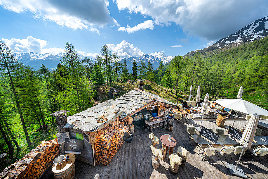 Den Weg zum Restaurant Moosalp auf 2048 M. ü. M. nimmt man gerne aus eigener Kraft in Angriff. Zu Fuss, mit dem Rennvelo oder dem Mountainbike. Entlang der Suonen, durch Lärchen- und Arvenwälder, über Stock und Stein und über Gipfel. Mitbringen sollte man Zeit. Um sich hinzusetzen und der herrlichen Stille zu lauschen. Um darin das Summen der Bienen zu entdecken, das Rauschen des Bergbaches und das Knacken eines Lärchenzapfens in der Hitze.