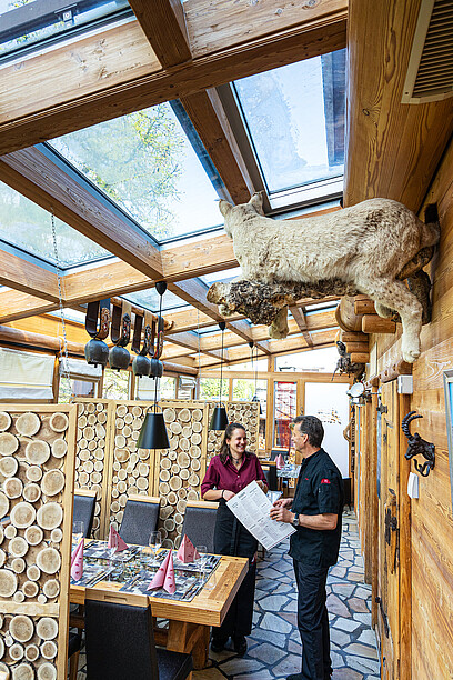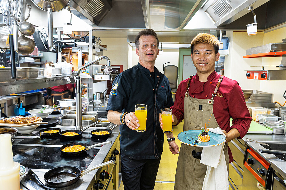 «Life is great», platzt es wie ein Wahlversprechen aus Amadé Kalbermatten heraus. Leidenschaft und Glück sind es, die ihn mit «seiner» Moosalp verbinden. Der ausgebildete Koch ist mit der Moosalp gross geworden. Das Anwesen befand sich schon lange in Familienbesitz, seine Eltern Werner und Balbina Kalbermatten übernahmen den Betrieb im Jahre 1990. Seine Mutter pflegte stets zu sagen: «Geh in die Küche, da hast du immer warm und genügend zu essen.» So schnürte er sich die Schürze um, absolvierte eine Kochlehre in Täsch, sammelte berufliche Erfahrungen in den Profi-Küchen von Visp, Brig, Saas-Fee und Montreux und kehrte wieder heim. Hier führte er den Betrieb gemeinsam mit seiner Schwester. Bis Carmen in den Betrieb einstieg. Ob die Kindergärtnerin und Primarlehrerin das musste, als Gattin des Moosalp-Wirtes? «Als ich mit 25 Jahren auf Weltreise war, schrieb ich in mein Tagebuch meine Zukunftspläne auf. Da war der Traum vom Gastgewerbe erwähnt. Doch vor dem Aufwand einer dreijährigen Servicelehre scheute ich mich», gibt Carmen Kalbermatten zu. Heute, sagt sie, hätte sie ihren Traum mit der Moosalp verwirklichen können. «Der Einstieg war hart», erinnert sie sich. Gekonnt bringt sie ihr Organisationstalent und die nötige Ruhe in den Betrieb. Das Ehepaar hat zwei Kinder. Sohn Jeremy besucht die Schweizerische Hotelfachschule in Luzern, Tochter Priscilla lernt Grafikerin EFZ. Ein bisschen zur Familie gehört auch das Team. 18 Mitarbeitende wirken im Service. Darunter einige Pensionäre, die im Raclette-Hüsli am Feuer stehen und den Käse inklusive Gäste zum Schmelzen bringen. Das Küchenteam besteht aus sieben Mitarbeitenden. Darunter Lobi und Jampa. Lobi hat vor einigen Jahren den Weg vom Flüchtlingsheim hoch zur Moosalp gefunden und legte eine Turbointegration hin. Heute bringt er zusammen mit seinem Freund Jampa ein Hauch von Tibet mit in die Küche.