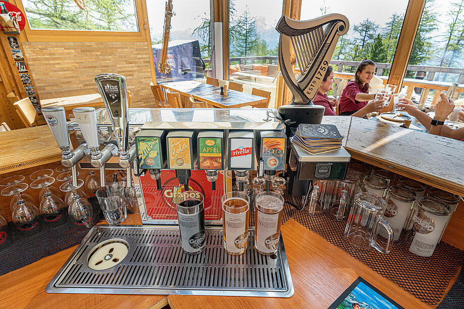 Im Herbst 2020 wurde im Restaurant das Buffet erneuert. Da nutzte man gleich die Gelegenheit, die Ausschankanlage nach zehn Jahren Betriebszeit zu revidieren. Den Karbonator haben die Grapos-Servicetechniker ausgebaut und im Werk in Worb komplett demontiert, gewartet und neu montiert. Oben am Schankomat erweiterte man das Angebot um weitere zwei Geschmacksrichtungen. «Um alles auf kleinstem Raum umzusetzen, haben wir die Double-Touch-Anlage installiert. Also einen Ausschankmodus, der übereinander angeordnet ist», erklärt Rolf Dütsch, Geschäftsleiter der Grapos Schweiz AG. Das Spezielle: Das Bier wird in derselben Anlage über einen separaten Ausschank-Hahnen ausgeschenkt. Für das Servicepersonal ist das praktisch. Amadé Kalbermatten flüstert plötzlich: «Also oft ist es ja so, dass der Service, den wir in der Deutschschweiz einkaufen, nicht so gut ist. Halt wegen der Distanz.» Und fügt deutlich lauter an: «Die Spezialisten von Grapos aber kommen immer sehr schnell, wenn etwas nicht funktioniert, einfach ein toller Service.»