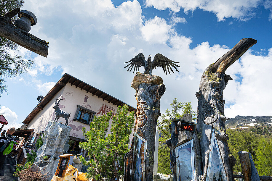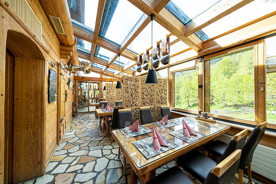 Heute steht den Gästen folgendes Platzangebot zur Verfügung: Im Restaurant 50 Plätze, im Wintergarten 30 Plätze, 24 Plätze in der Mischabel-Lounge, 120 auf der Südterrasse und 30 auf der Nordterrasse. Zum Apero trifft man sich, wenn nicht draussen auf der Terrasse, gerne auch im Weinkeller am langen Tisch für 16 Personen. Wo man auch hinschaut – überall deckt man Geschichten von früher auf, sei es auf Fotos, auf Holzdrucken, in Zitaten und in Malereien auf der Fassade. «Damit man die Herkunft nicht vergisst», erklärt Carmen Kalbermatten die Details.