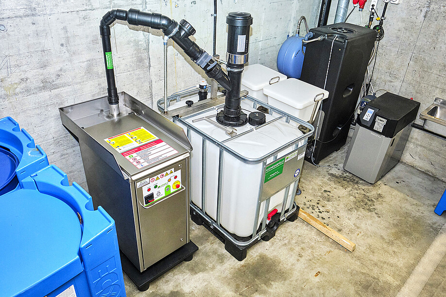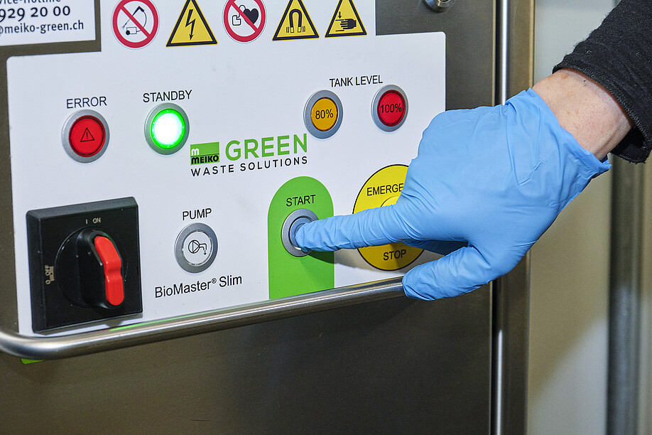 Im Zuge des Neubaus testete die Klinik für die Entsorgung von Nassabfällen ein BioMaster-Modell von Meiko Green Waste Solutions. Die Funktionsweise von Meiko Green ist einfach: Speisereste kommen in eine Eingabestation, wo sie auf Knopfdruck in 60 Sekunden zu einem pump- und fliessfähigen Brei homogenisiert werden. Die integrierte Pumpe fördert das Substrat in den Sammelbehälter, wo es geruchsneutral und ohne Kühlung bis zur Abholung lagert. Zur Kostenoptimierung lässt sich die Entleerung mit der Fettabscheider-Absaugung kombinieren. «Ein geschlossenes System, geruchlos, sauber und damit ein zeitgemässes Werkzeug der modernen Küche», sagt Sabine Hagg, die bereits Meikos Spültechnik kennt und schätzt, vom BioMaster gelesen und deshalb in der Klinik eine Testphase initiiert hat.
