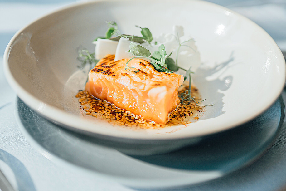Die hohe Qualität sowie die niedrige Temperatur des Wassers zusammen mit nachhaltiger Ernährung und reichlichem Schwimmen geben dem Lachs sein unvergleichlich filigran marmoriertes festes Fleisch und seinen einzigartigen frischen Geschmack.