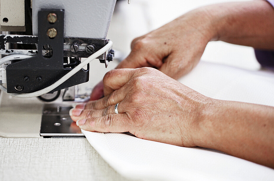 Allerdings: Der überdurchschnittlich hohe Technologie-Standard in der Weberei allein genügt nicht, um die einzelnen Produkte bis ins letzte Detail zu fertigen. Deshalb nähen, schneiden und finalisieren die spezialisierten Mitarbeitenden in der Konfektionsabteilung die Stoffe in präziser Handarbeit.