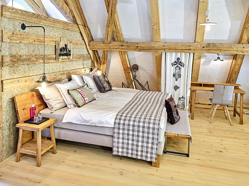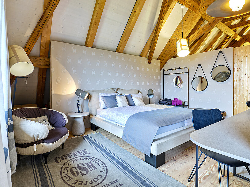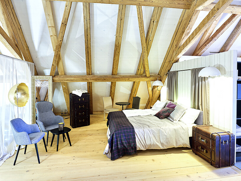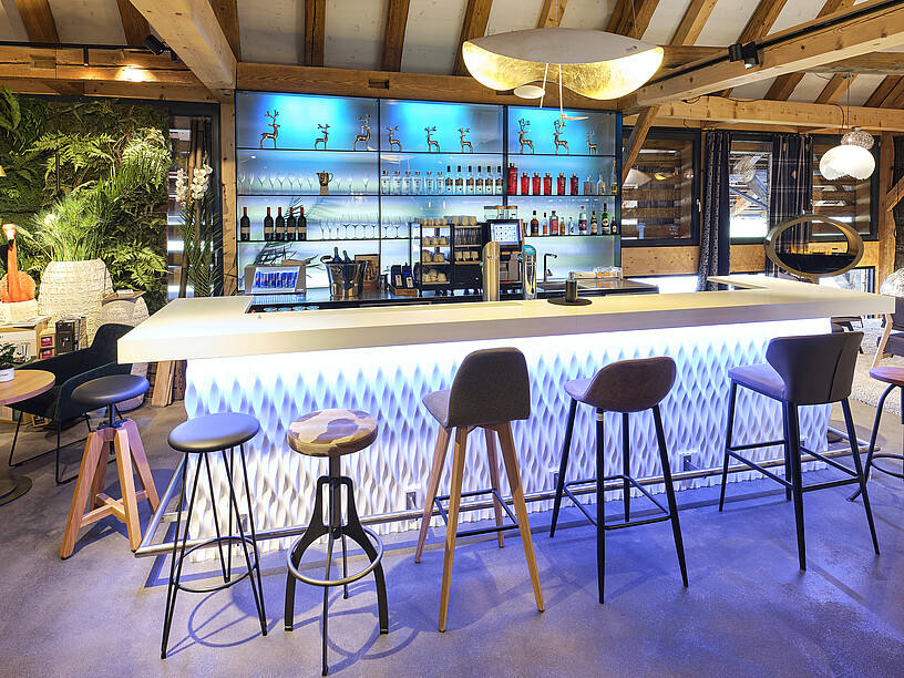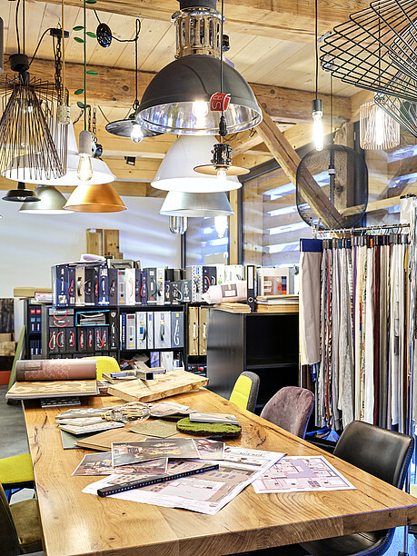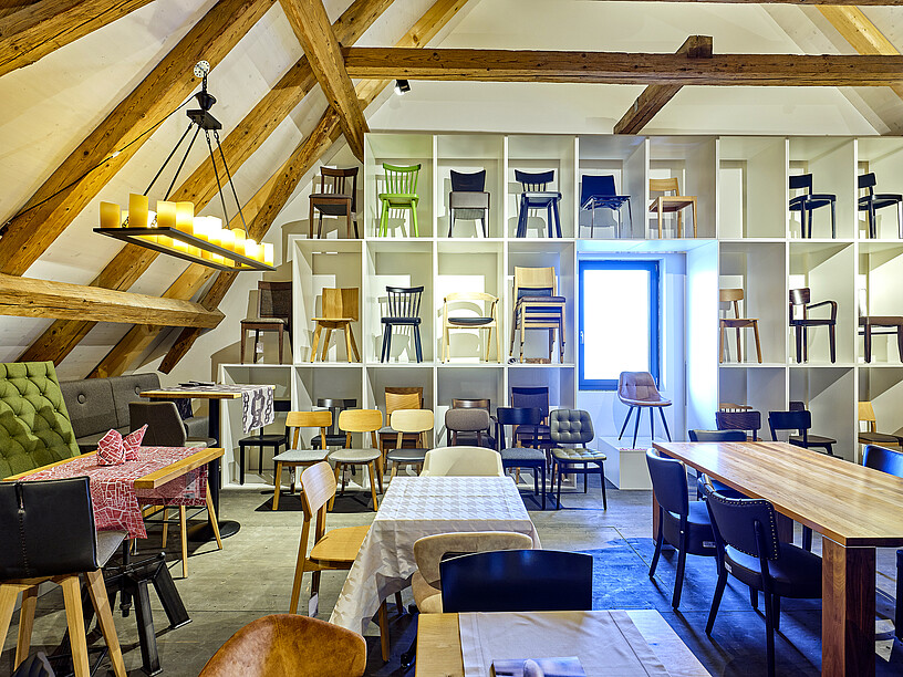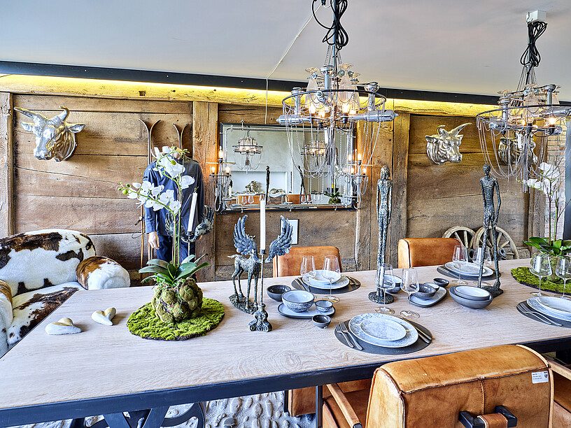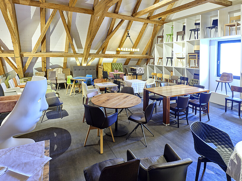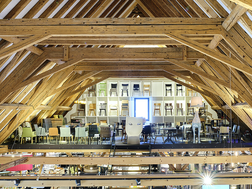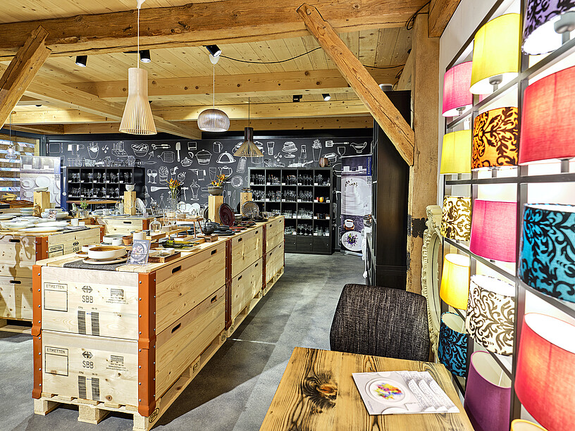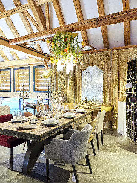 Eine Ausstellung, die sich fliessend von Stil zu Stil bewegt, mal urban, mal edel, mal jung und spritzig, mal klassisch modern. Hier die coole Interpretation eines Kronleuchters mit magnetischen Hänge-Blumen, dort zwei lachsfarbene Flamingos in übergrossen Blumenvasen, gemütliche Sessel auf beigem Hochflorteppich, ein Effektfeuer, das flackert, extravagante Hingucker neben lauschigen Ecken – und das alles in einem geschichtsträchtigen Haus, offen bis in den Giebel, dicke Balken, die im 240 Jahre alten Bauernhaus Stabilität und Dauerhaftigkeit vermitteln. Genauso wie die Gschwend AG, die 1942 als Möbelhaus startete und ab 1990 mit Geschäftsführer Hans Brönnimann den Fokus auf Gastrobauten richtete. In Zusammenarbeit mit Raymond Zürcher entwickelte der Innenarchitekt das Unternehmen zu einem Kompetenzzentrum für Projekte für Gastronomie, Hotellerie und Ladenbau.