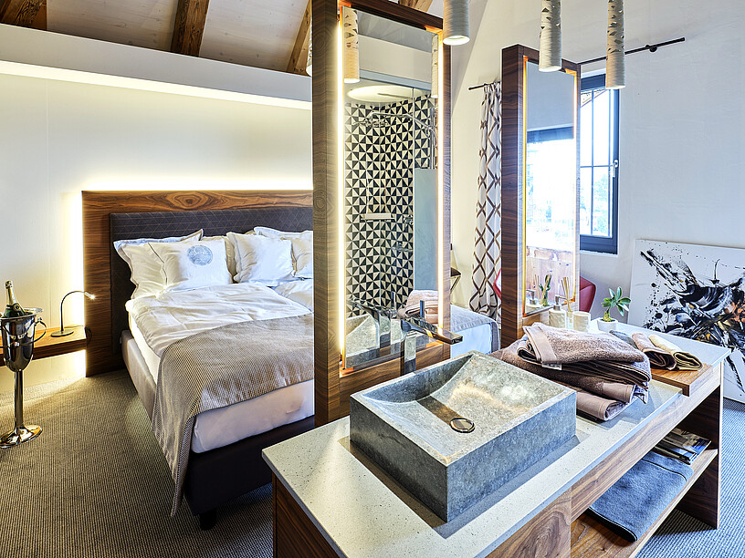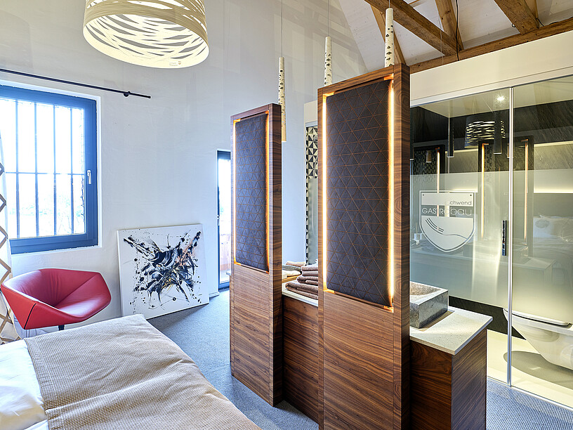 Der Showroom der Gschwend AG Gastro-Bau ist berauschend, eine Welt zum Abtauchen, Stöbern, Staunen. 500 Quadratmeter, die inspirieren, überraschen und mit komplett eingerichteten Hotelzimmern in diversen Stilrichtungen, gedeckten Tafeln, gemütlichen Lounges und einer modernen Bar den Blick sowohl fürs grosse Ganze schärfen als auch für viele kleine Details, für kunstvolle Accessoires, Table Top, Porzellan und Kristallgläser, für das nur scheinbar Nebensächliche. «Wir können vom Bodenbelag bis zum Kaffeelöffel alles zeigen», betont Raymond Zürcher, Geschäftsführer der Gschwend AG Gastro-Bau, gegenüber GOURMET. Stühle aus Leder, Samt, Holz oder Kunststoff, schön assortiert im überdimensionalen Setzkasten, einen beeindruckenden Überfluss an Lampen perfekt inszeniert, stilsichere Bilder, begrünte neben cool tapezierten Wände, Stoffmuster, Vorhänge, Servietten, Uniformen….