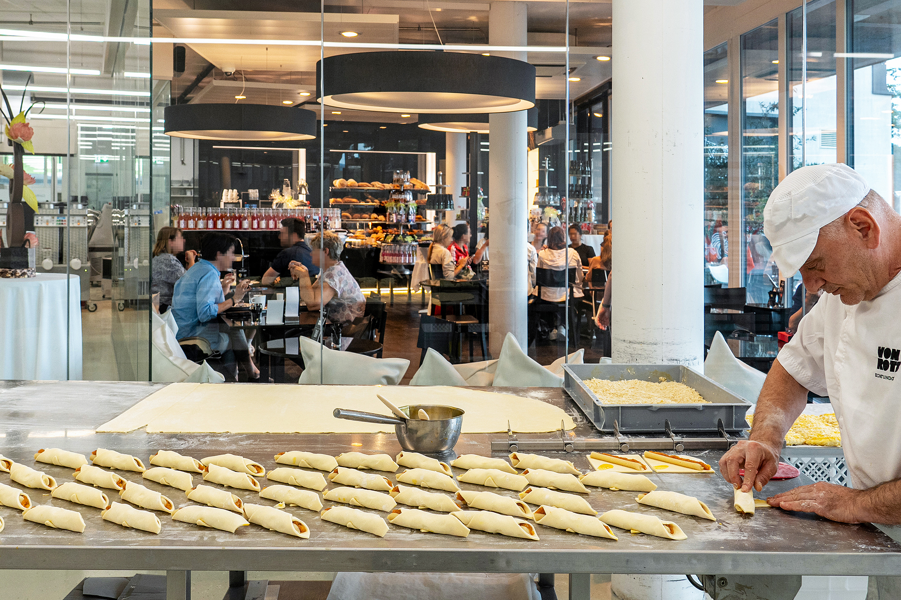 Der Erfolg der Filiale liegt in der guten Erreichbarkeit. Kundinnen und Kunden können direkt vor dem Geschäft parken, ihren Kaffee und frische Brötchen mitnehmen und sind blitzschnell auf der Autobahn. Im Café selbst geniessen Gäste einen ungewohnt spannenden Blick in die Backstube. Und dann ist da noch der Sonntagsbrunch mit klassischer Etagère – der absolute Renner, filialübergreifend. Ohne Reservation geht gar nichts! «Wird es voll, servieren wir hier in Lindencham sogar in der Produktion an modernen Hochtischen oder die Gäste nehmen die Etagère mit nach draussen.» Das begeistert!