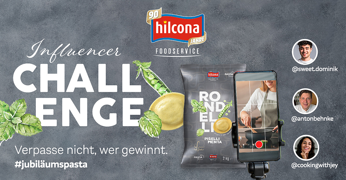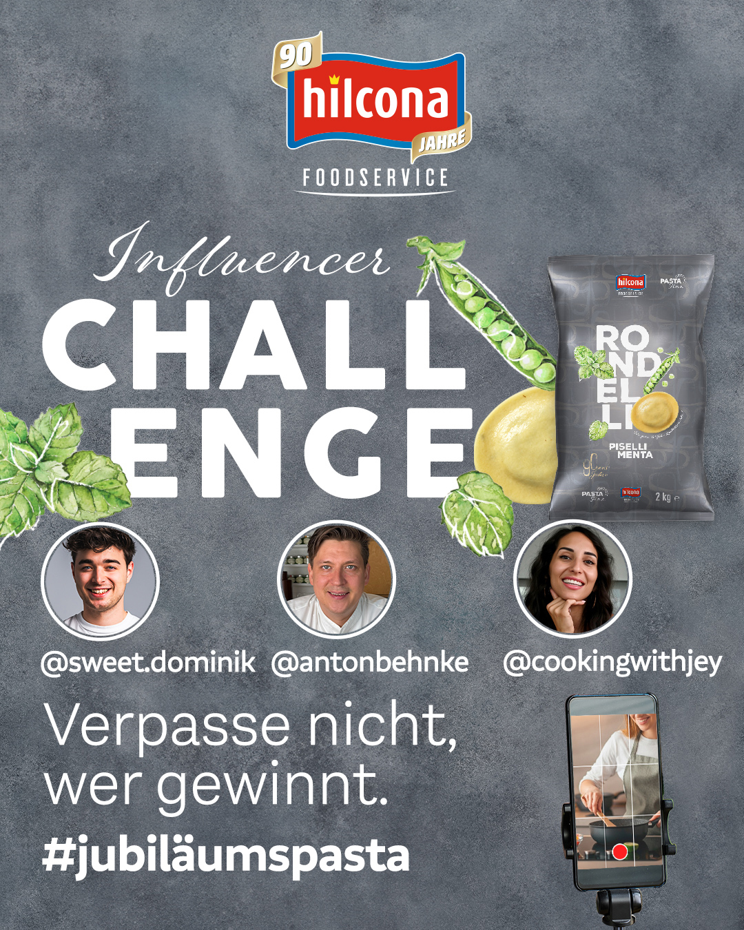 Die frische und leichte Jubiläumspasta lädt zu kreativen Rezepten ein – und was wäre dafür geeigneter als eine Social-Media-Challenge anlässlich des 90-Jahr-Jubiläums von Hilcona. Die Food-Influencer-Stars Anton Behnke (DE), Dominik Süss (AT) und Jennifer Cisullo (CH) zeigen, was in der Jubiläumspasta von Hilcona steckt. Die drei kreativen Köpfe erstellen je ein Video mit einem eigenen Rezept und demonstrieren, wie vielseitig die Erbse-Minze-Pasta ist. Das Video mit den meisten Shares gewinnt.