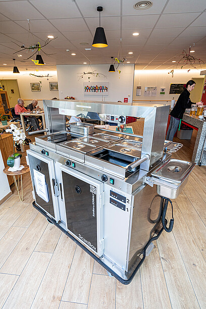 «Wir haben vier mobile ScanBox-Servicestationen für Cook&Serve-Anwendungen in Betrieb genommen, je eine für die vier Wohngemeinschaften», erklärt Beat Schmalz, Geschäftsinhaber der Schmalz Distributions-Systeme AG, gegenüber GOURMET. «Food2Go ermöglicht dank integriertem Kalt-/Warmhaltekonzept den gepflegten Service beim Gast. Die Servicestationen sind formschön, vielseitig und überraschend leicht, dank einer Bauweise aus eloxiertem Aluminium auf der Innen- und einem mit Glasfaser verstärkten Kunststoff-Laminat auf der Aussenseite. Auch die geschäumte Schicht dazwischen ist leicht und hält die Temperatur im Innenraum lange konstant.»