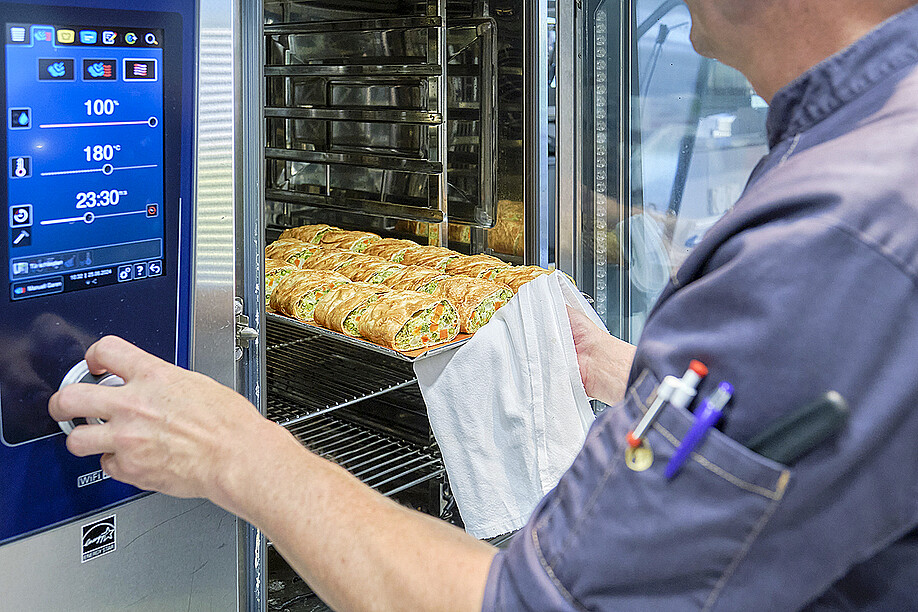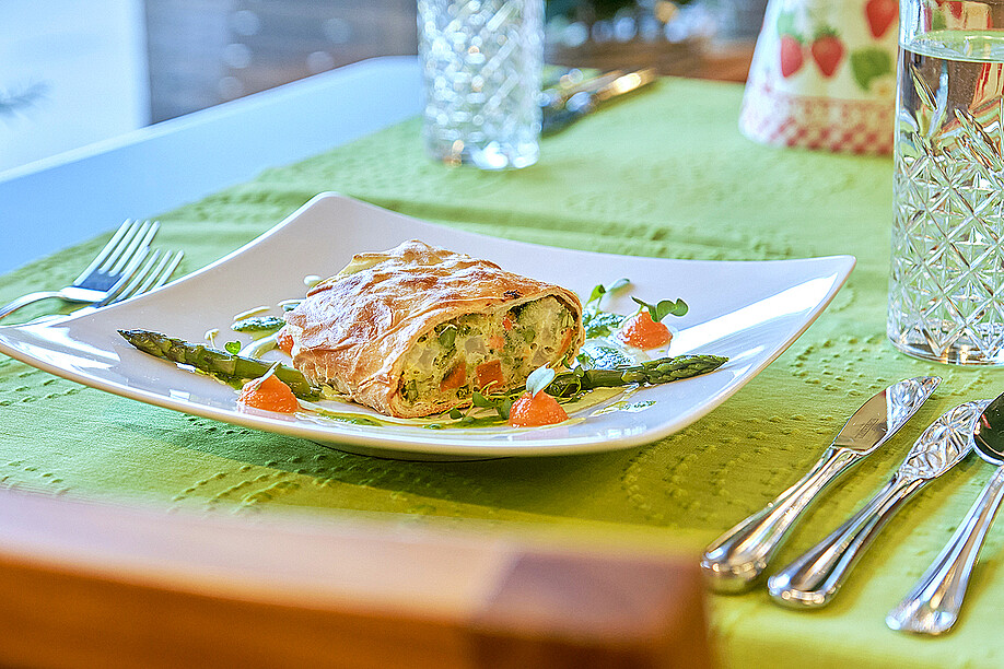 Seit Jahren setzt der St. Galler Küchenchef hierbei auf Produkte von Delicool, der Eigenmarke für Tiefkühlspezialitäten des Lebensmittel-Importeurs und -Distributors Delico. «Ich kenne ihr Angebot schon seit längerem und habe auch bei meinem früheren Arbeitgeber auf sie zählen können», erzählt Kappler. Denn: «Primär sind es einfach gute Produkte.» Er bekomme bei Delico genau das, was er brauche – unter anderem den tiefgekühlten Kartoffelgratin, der sich in vorgefertigten Portionen beziehen lässt. «Der ist fürs Catering sehr gut geeignet.» Und mit den Gemüsestrudel-Schnitten als Beilage lassen sich optimale Nachtessen kreieren, die auch bei den Bewohnern oder dem Heimpersonal sehr beliebt seien. Im knusprigen Strudelteig enthalten sind Rüebli, Broccoli, Erbsen, Bohnen, Blumenkohl sowie Kohlrabi. Nach 30 Minuten im Kombidämpfer sind die gemüsereichen Strudel servierbereit.