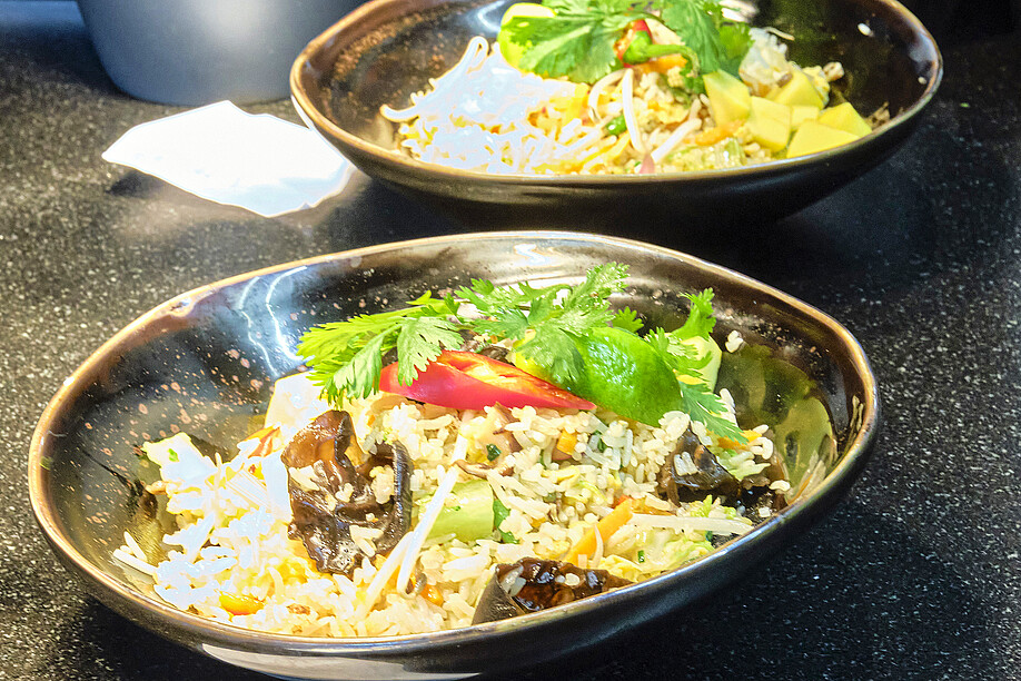 Das Resultat ist eine phantastische Kulisse, welche den Genuss der Gäste mit viel Atmosphäre anreichert. Inspiration für die Nooch-Filialen sind übrigens die Noodlebars aus Asien, die dort seit mehr als 200 Jahren sehr populär sind. «Nooch» bedeutet «Noodles mampfen». Entsprechend vertreten sind Noodle-Gerichte auf der Speisekarte. Aber auch Curries, Fried Rice, Sushi und Soups werden serviert. Darunter einige Gerichte der ersten Stunde: «James-Bond-Fried-Rice beispielsweise war von Anfang an im Angebot», sagt Kay Malsch-Spitzer und erklärt, dass die Familie Wiesner Gastronomie seit drei Jahren intensiv und fokussiert an vegetarischen, veganen und plant-based Varianten arbeitet.