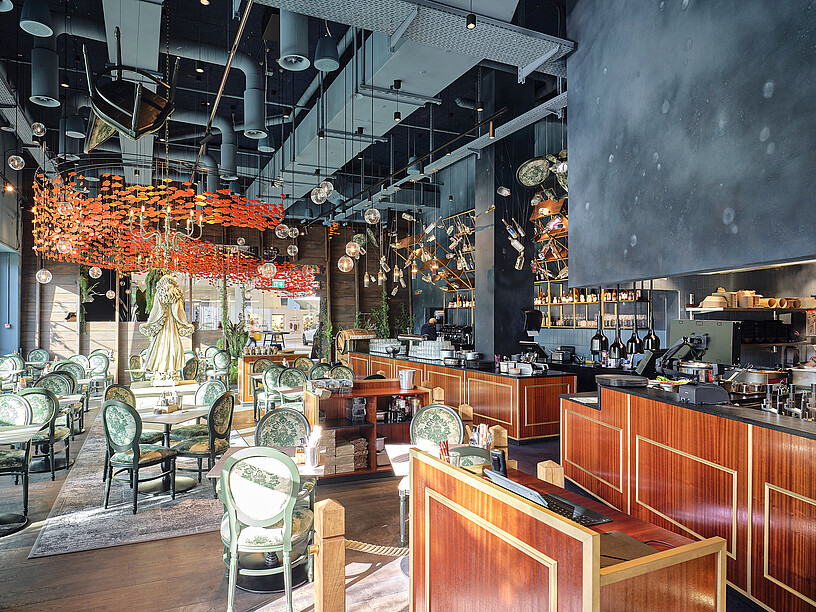Die Story entstammt der Feder von Ivo Christow, dem Lead Design (Innenarchitekten) bei Krucker & Partner, welcher für die Familie Wiesner Gastronomie auch schon andere Restaurants umgesetzt hatte. «Am Anfang jedes neuen Projekts steht immer eine Story. Sie hilft dem Verständnis und schärft das Mindset aller Beteiligten mit einem sichtbar besseren Ergebnis», erklärt Kay Malsch-Spitzer. Die Geschichte haucht Bauplänen also sozusagen Leben ein, füllt sie mit Farbe und lebendigen Bildern. Eine Storyline als Inspiration und Ziellinie – nicht nur für die Innendekorateurinnen und -dekorateure, sondern beispielsweise auch für die Küchen-Spezialistin Gamatech AG. «Auch uns hilft die Story bei der Umsetzung», sagt Christian Kunz, Geschäftsführer der Gamatech AG.