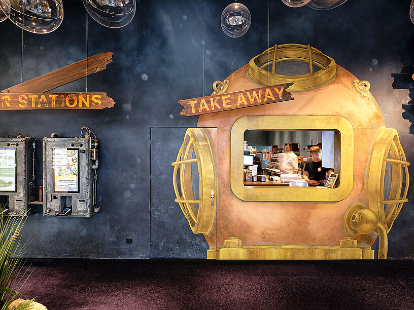 Die Bar im Schiffbruchstyle, schwimmende Flaschen, ein Schwarm oranger Fische und Luftblasen in Form runder Hängelampen bilden diese Unterwasserwelt ab. Hat man die Insel erreicht, betritt man zuerst ein edles Restaurant. Hier sitzen die Gäste auf mit Samt bezogenen Polsterstühlen, während im hinteren Restaurant-Teil Hafenatmosphäre herrscht. Boote dienen als Essnischen, ebenso wie die Marktstände, die etwas erhöht mit viel Krims-Krams liebevoll dekoriert sind. Und wer noch etwas weiter eintaucht, findet sich im Rotlichtmilieu wieder, viel roter Samt und eine Poledance-Stange deuten zumindest ansatzweise darauf hin.