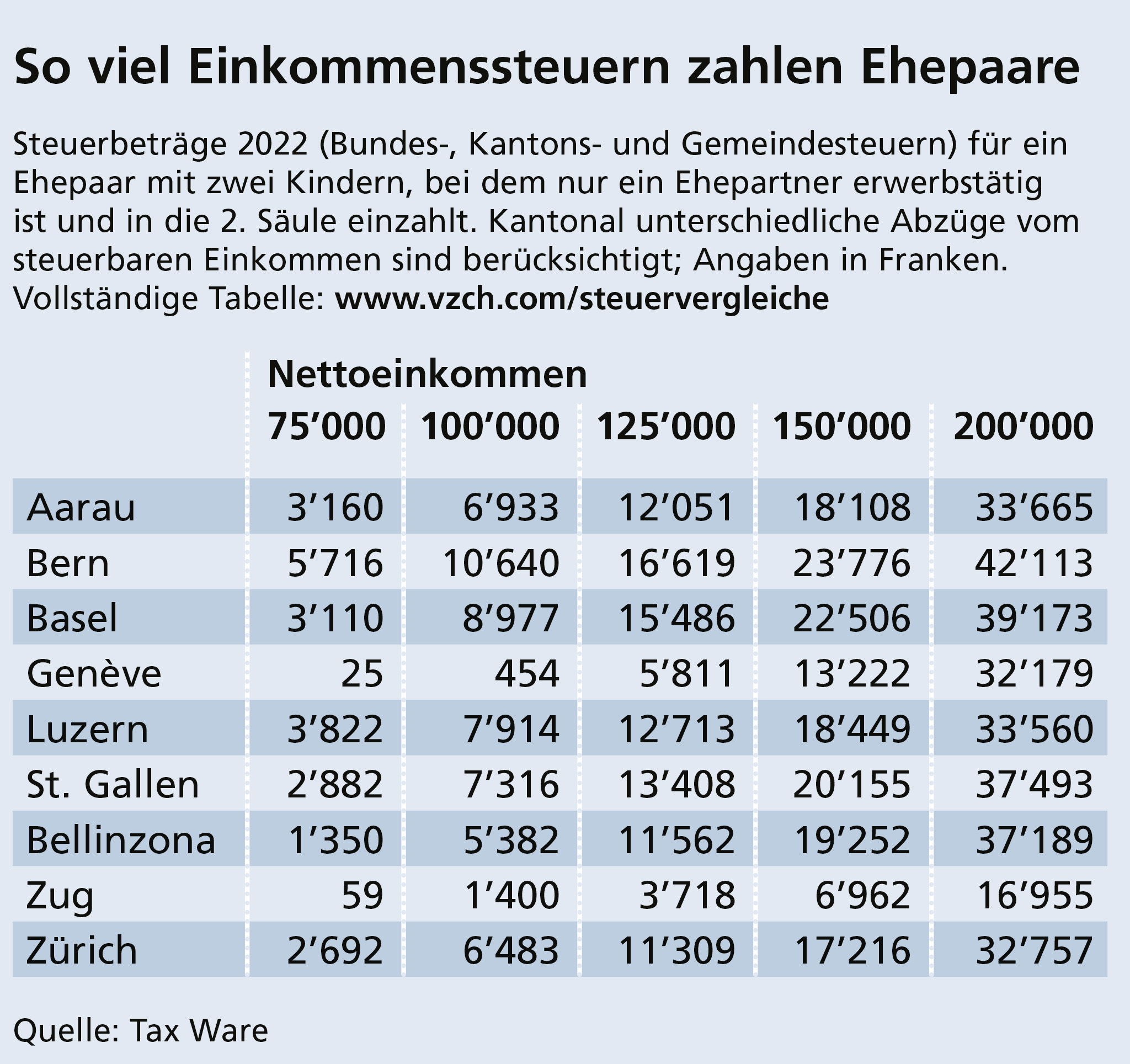 Die meisten Erwerbstätigen zahlen in der Schweiz vor allem Einkommenssteuern. Wie hoch diese sind, hängt davon ab, wie viel man verdient. Entscheidend ist auch, wo man wohnt, denn jeder Kanton hat eigene Steuergesetze. Das führt dazu, dass die Steuertarife von Kanton zu Kanton unterschiedlich sind. Und die Unterschiede können sehr gross sein: So zahlen Ehepaare mit 200 000 Franken Nettoeinkommen im steuergünstigen Zug rund 17 000 Franken Steuern. In St.Gallen wären es rund 37 500 Franken und in Bern mehr als 42 000 Franken (vgl. Tabelle).