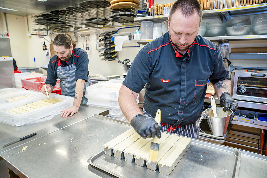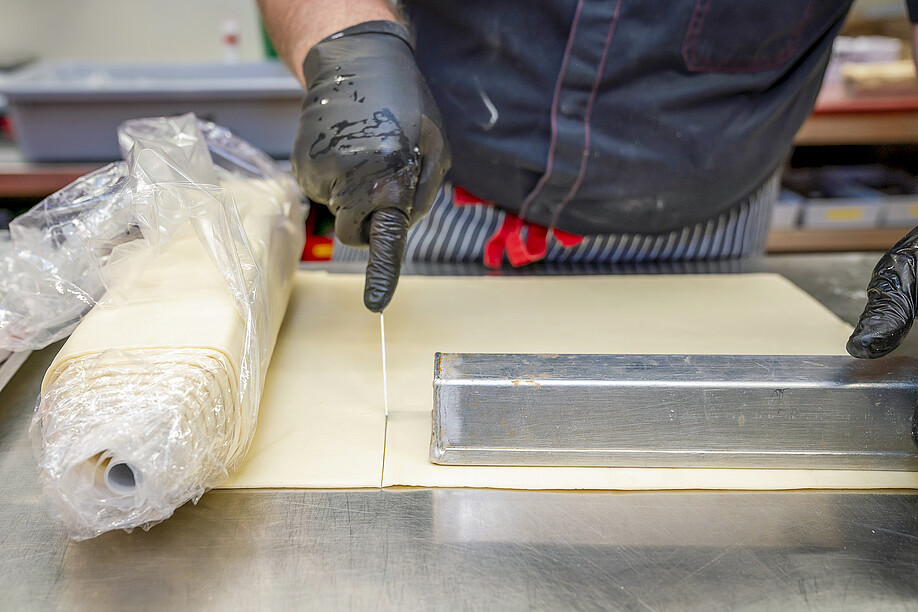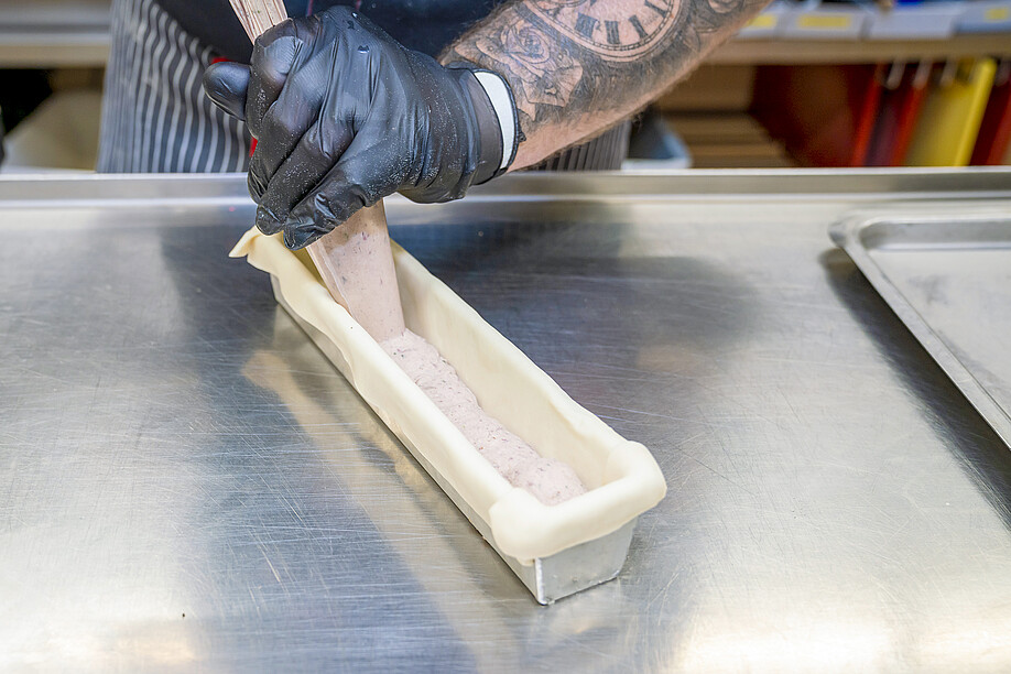 Rolf Kirchhofer: Wir bestellen anfangs Woche den Teig. Geliefert wird innert zwei Tagen, wir sind ja nahe beieinander und die Prozesse haben sich eingespielt. Eine Woche später verarbeiten wir den Teig. Er wird zugeschnitten, mit unserem Brät gefüllt, mit einer speziellen Technik verschlossen und zuletzt gebacken.