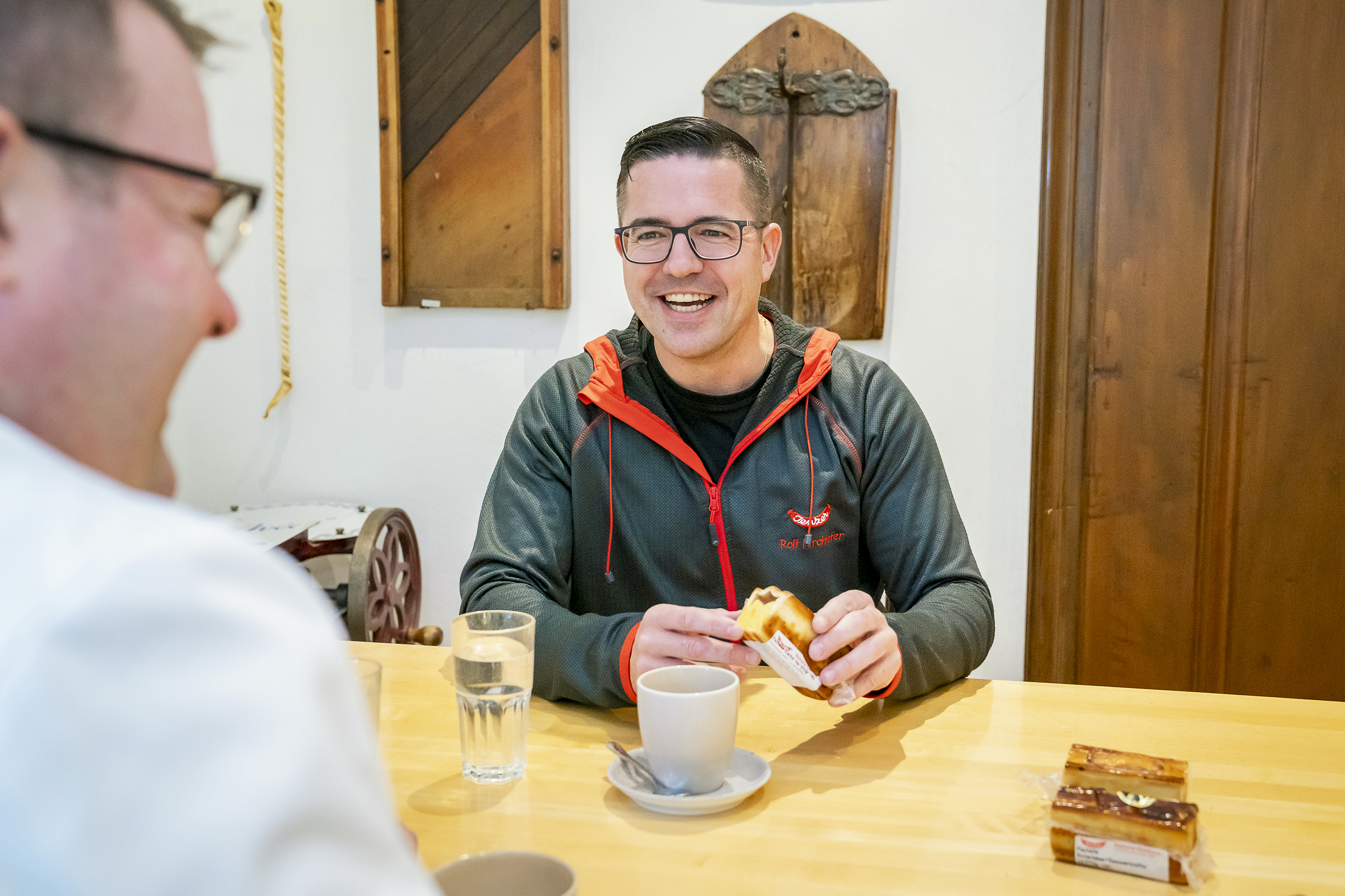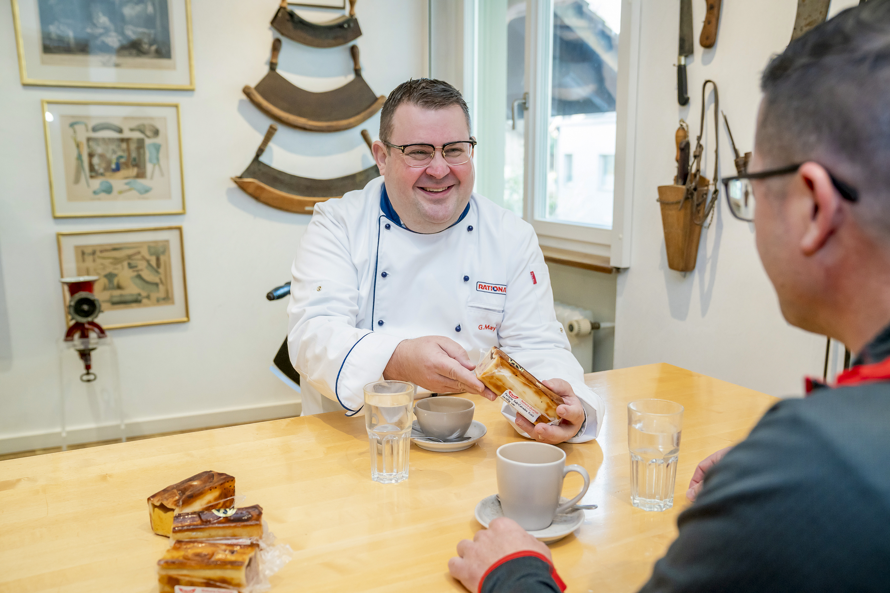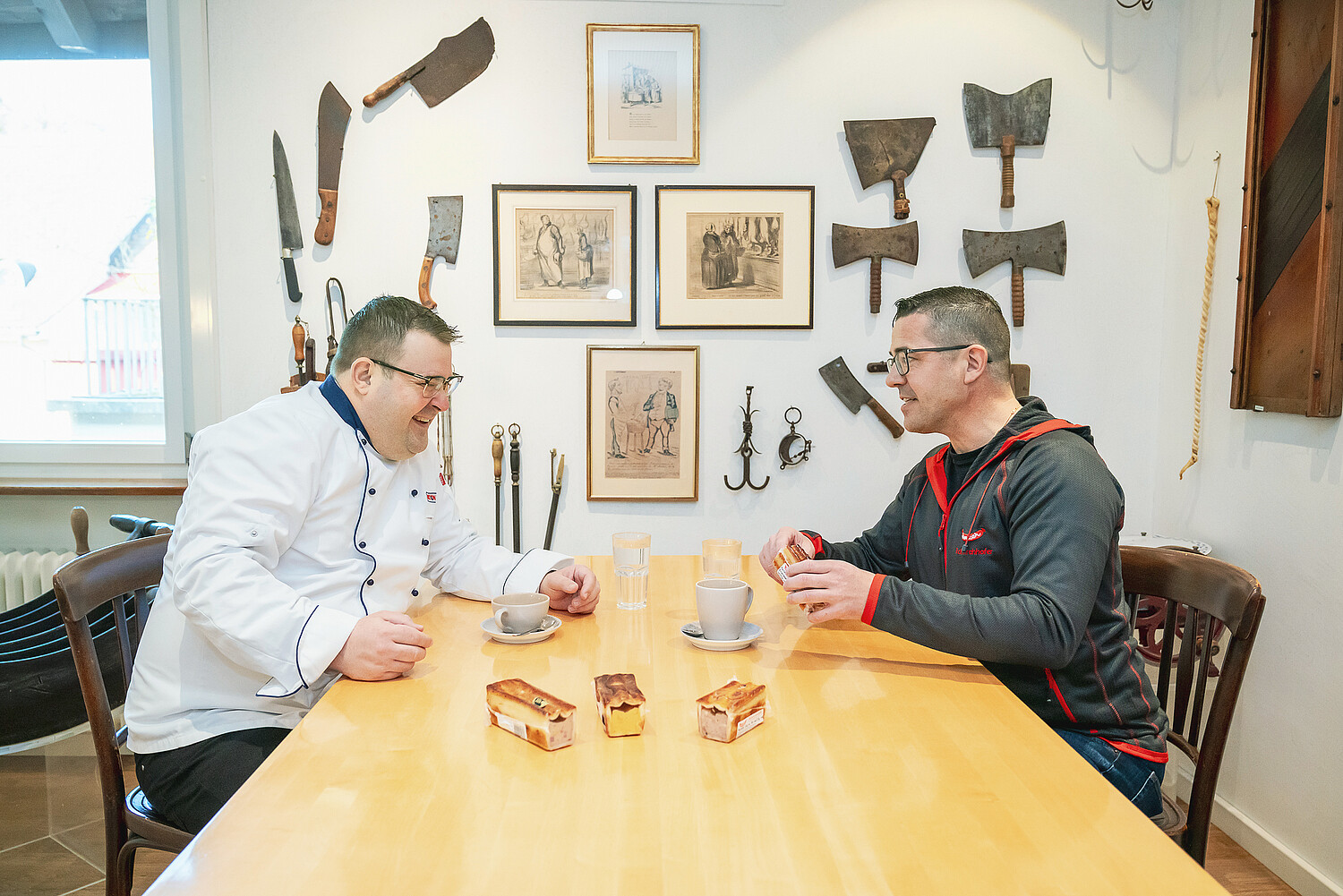 Rolf Kirchhofer, Leiter des Partyservices und der Traiteurproduktion, ist seit 1997 bei der Jenzer Fleisch und Feinkost AG tätig und ausgewiesener Spezialist in Backangelegenheiten. Er trifft sich mit Guido Mayer im Metzgerstübli des benachbarten Hotels Ochsen auf ein Gespräch «von Chef zu Chef».