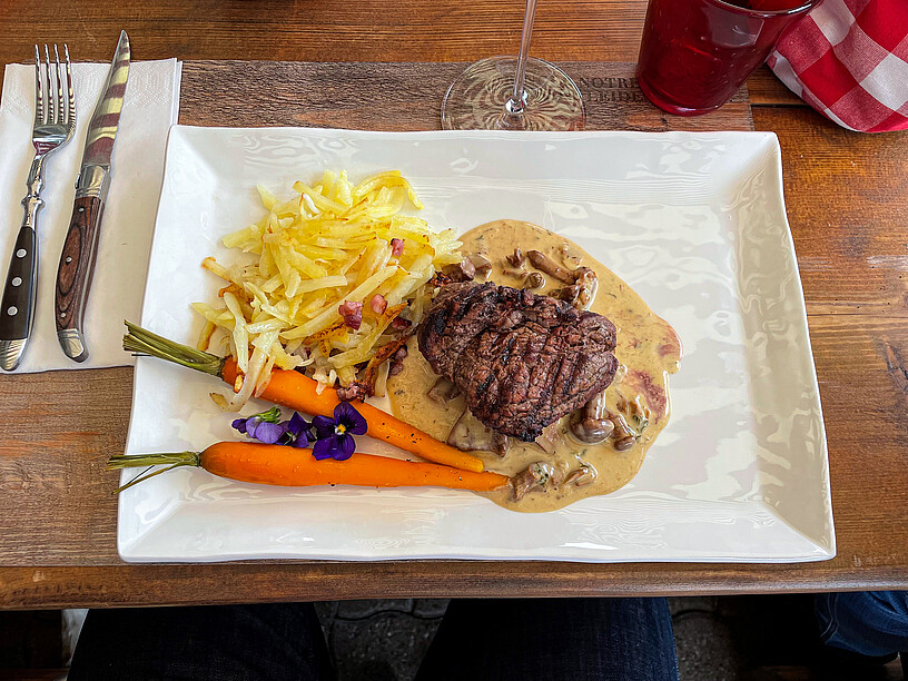 Einen Beweis seines Könnens präsentierte Patric Dillon den illustren Gästen aus Politik, Wirtschaft, Alpgenossen- und Nachbarschaft: Eringersteaks mit Brägu, frischen Steinpilzen und hausgemachter Rösti wurden zur Eröffnung der «Eringer Lodge» serviert. Das Fleisch der eigentlich «äusserst friedvollen Kampfkühe ist sehr zart und ein exquisiter Geschmacksträger», sagt der urchige Feinschmecker. Er setzt bei all seinen Gerichten auf «absolut frische Produkte aus der Region».