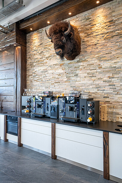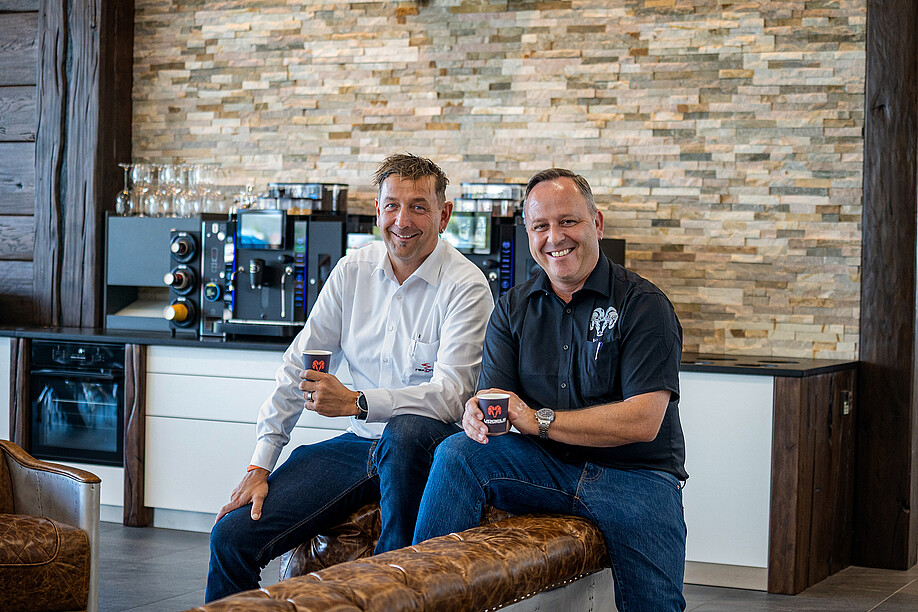 Im Offroads sitzen die Kunden für Verkaufsgespräche in genieteten Ohrensesseln und auf Polstern aus feinstem Rindsleder. Im Foyer stehen ein XXL-Chesterfieldsofa und zwei Kaffeevollautomaten S500 von Rex-Royal, prächtig und stolz wie der Büffel, der über ihnen thront. Zwei Kraftpakete, die nicht nur klassische Kaffeespezialitäten zubereiten, sondern auch Spargelcrèmesuppe, Gemüsebouillons und Getränke mit Schuss. «Ersteres dank zwei integrierten Instant-Behältern, letzteres dank dem Aromamodul, das Getränke mit bis zu drei verschiedenen Aromen verfeinert. Man kann also einen Caramel Latte Macchiato oder einen Kaffee mit Güx auf Knopfdruck zubereiten», erklärt Mona Petersen, Marketing Manager bei der Rex-Royal AG. Das ist technisches Multitasking auf hohem Niveau.