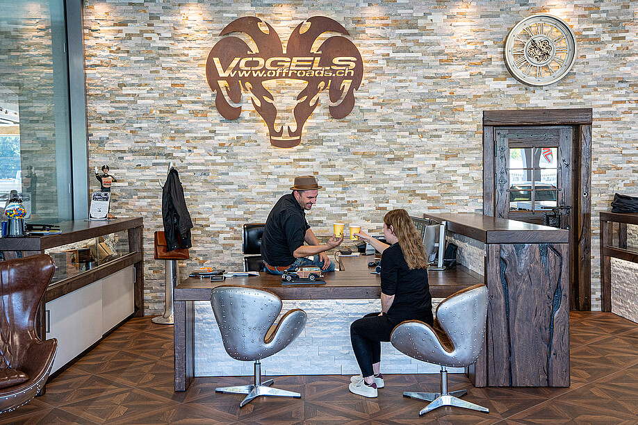 Gleichzeitig ist sein Lager riesig, um interessierte Kundinnen und Kunden nach wie vor zeitnah zu bedienen. Wobei wir eigentlich guten Gewissens auf die gendergerechte Schreibweise verzichten und nur von «Kunden» sprechen können: Denn es sind fast ausschliesslich Männer, die im Offroads einkaufen. Sie kommen mit festen Vorstellungen, sind gut informiert, technikversiert und anspruchsvolle Autofans. Entsprechend viel Wert legt André Vogel auf eine coole, amerika-inspirierte Atmosphäre: Gigantische Hallen mit grossen Plattenböden, hohes Mauerwerk bestückt mit kleinen Natursteinen, eine Lounge mit Fumoir und Zigarren, die André Vogel direkt aus Nicaragua importiert. Massives Eichenholz umrahmt Lifte und Türen. Das Holz stammt aus den umliegenden Wäldern und wird in der hauseigenen Schreinerei verarbeitet. Er habe immer Holzarbeiten am Laufen und verkaufe inzwischen auch Holztische, solche aus schwerem Eichenholz, dunkel lasiert, imposant im Look. Wen wundert’s. Und die Tiefgarage haben wir noch nicht einmal gesehen, auch die sei bombastisch. Grossartig vom UG bis unters Dach.