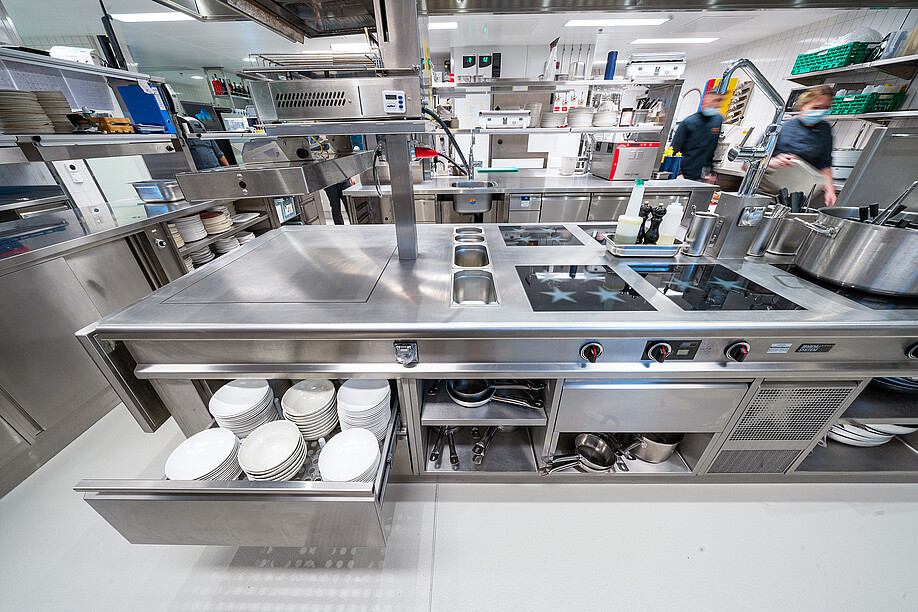 - Die Überbauten bei der Getränkeausgabe sind gelocht, für eine hygienische Lagerung der Gläser. Gleiches gilt teils auch für die Schubladenfronten.