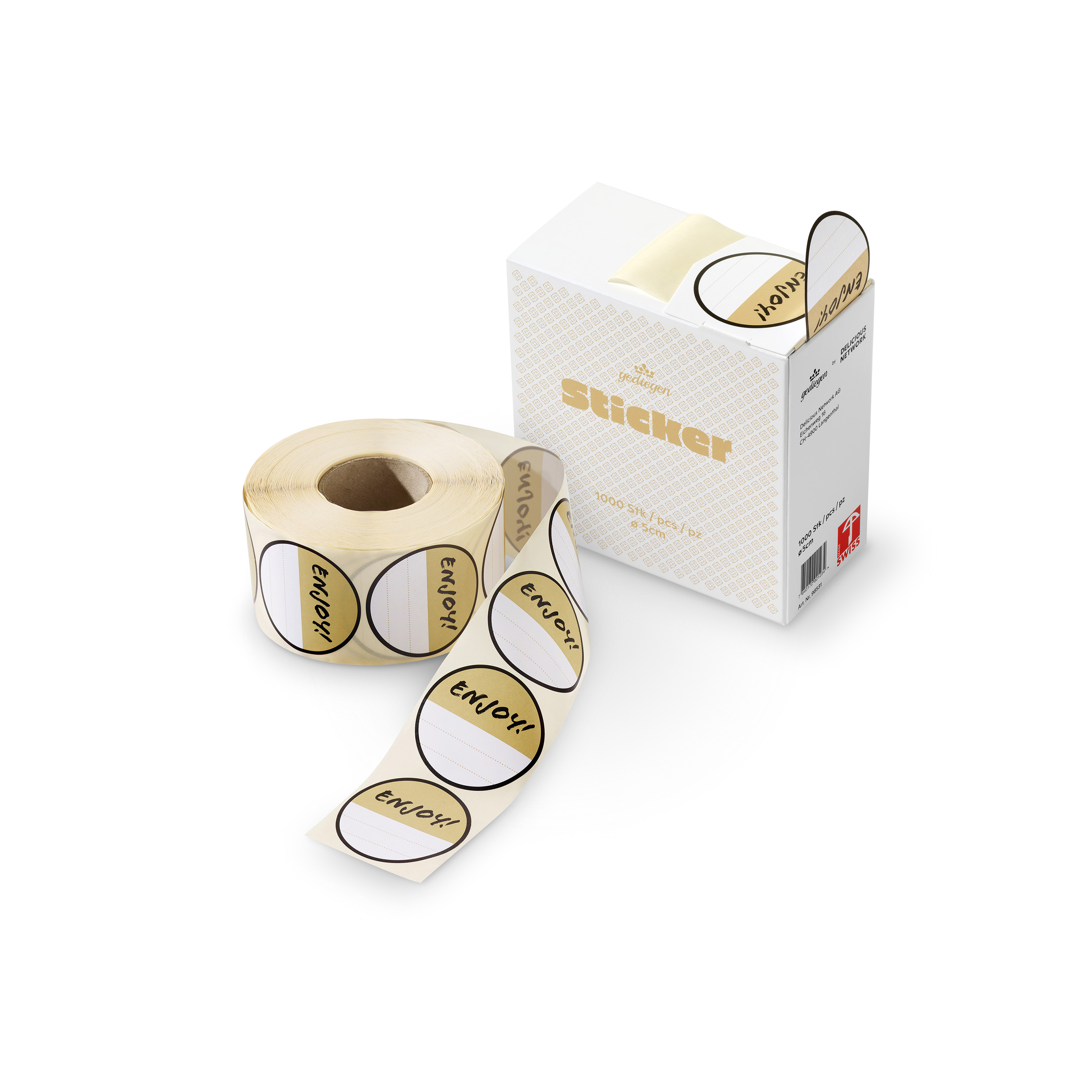 Das Wickelpapier lässt sich ideal mit dem «Enjoy»-Sticker kombinieren, der die umwickelten Speisen zuverlässig versiegelt und Platz für persönliche Botschaften bietet. Die Sticker haben einen Durchmesser von 5 cm und sind im praktischen Dispenserkarton à 1000 Stück erhältlich.