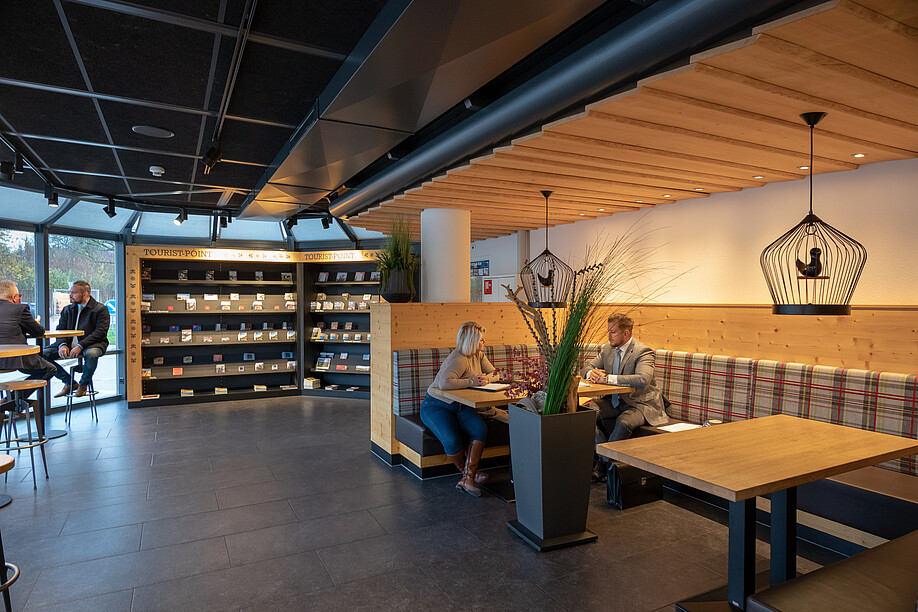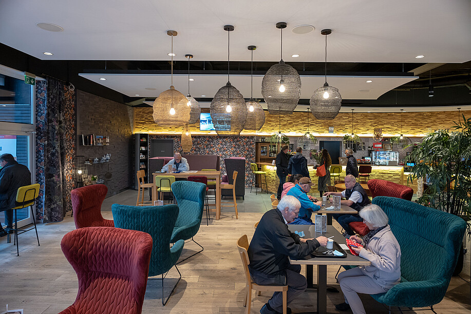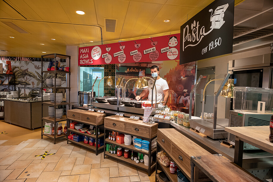 Die Entdeckungsreise lässt dann doch plötzlich den Magen knurren, und so wandert man in den Free Choice-Bereich. Und will auch hier zuerst alles entdecken, so schön und gluschtig wird alles präsentiert. Der Gast bedient sich mit Herzenslust an einer grossen Auswahl frisch zubereiteter Speisen, stellt sich seinen Gemüseteller zusammen oder schöpft an der asiatischen Garküche seine Maxi Bowl. Wer dem Landhaus-Charakter von früher nachtrauert, bestellt den Hackbraten und die Rösti und geniesst das Währschafte in der Rattan-Lounge mit Sicht Richtung Berge. Arbeitsnomaden setzen sich in den Coworking-Space, der die nötige Ruhe für die konzentrierte Arbeit bietet. Familien wählen einen Tisch neben der grosszügigen Kinderecke. Während sich die Kleinen austoben können und so wieder fit für die Weiterreise sind, erholen sich die Eltern bei einem lockeren Schwatz am Tisch. Apropos Kinder: Diese können sich an der Softeismaschine selbst eine Glace machen. Da möchte man doch glatt wieder ein Dreikäsehoch sein.