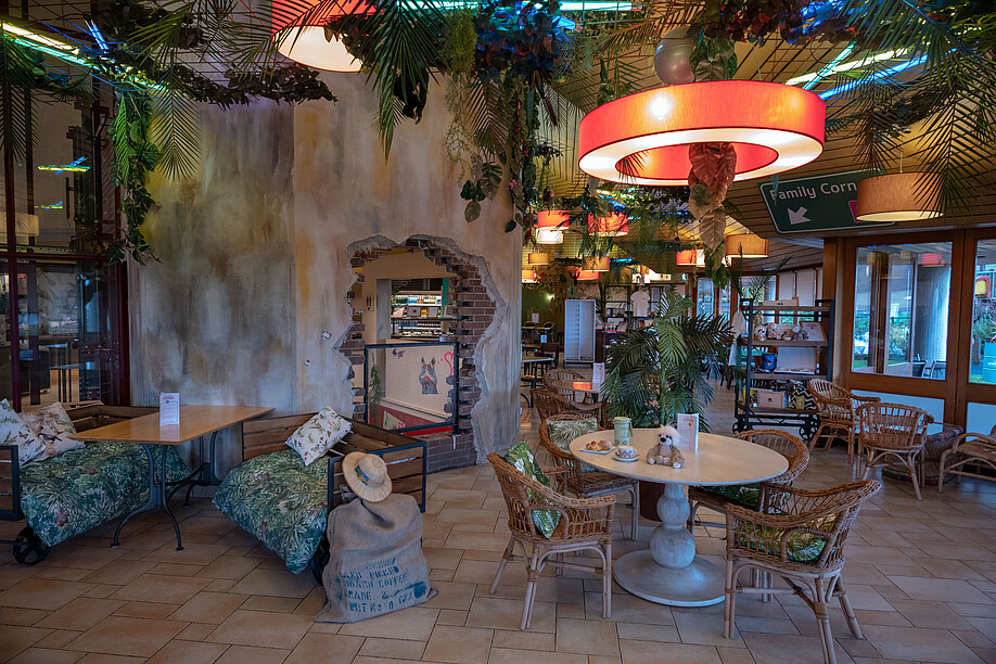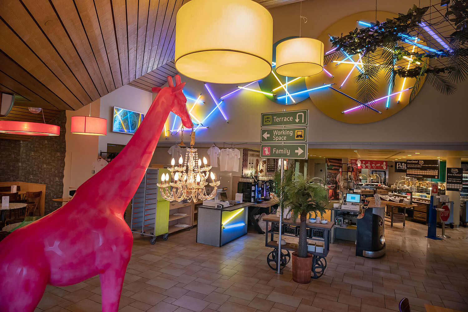 Ein kurzer Halt zum Lauschen auf der Treppe hinauf zum Restaurant Nord lohnt sich: Da trompetet ein Elefant, dort schreit ein Schimpanse, das Zischen gehört wohl zur Schlange, in der Ferne brüllt ein Puma und gleich nebenan krächzt ein Kakadu. Welcome to the Neon-Jungle! Hier muss man sich erst einmal orientieren, sich umsehen und alles auf sich wirken lassen. Hier stürzt man sich nicht gleich ans Buffet, hier geht man zuerst auf Entdeckungsreise. Am liebsten in Safarihose und Feldstecher. Grünpflanzen hängen von der Decke, Palmen verleihen Ferienfeeling, auf dem alten Holzbuffet präsentieren sich Deko-Artikel zum Kauf, Dschungeltiere in Plüsch lächeln aus einer Ecke hervor, an der Wand stapeln sich Kaffeesäcke aus Jute, und der absolute Eyecatcher bildet die riesige Giraffe in Pink. Diese hält tatsächlich eine antik anmutende Lüster im Maul. Als ob das nicht schon verrückt genug wäre, hängen an Decken und Wänden Leuchtröhren in Neonfarben.