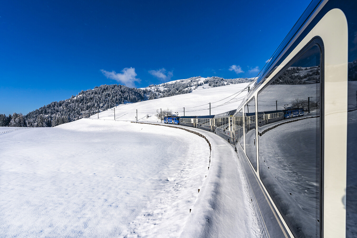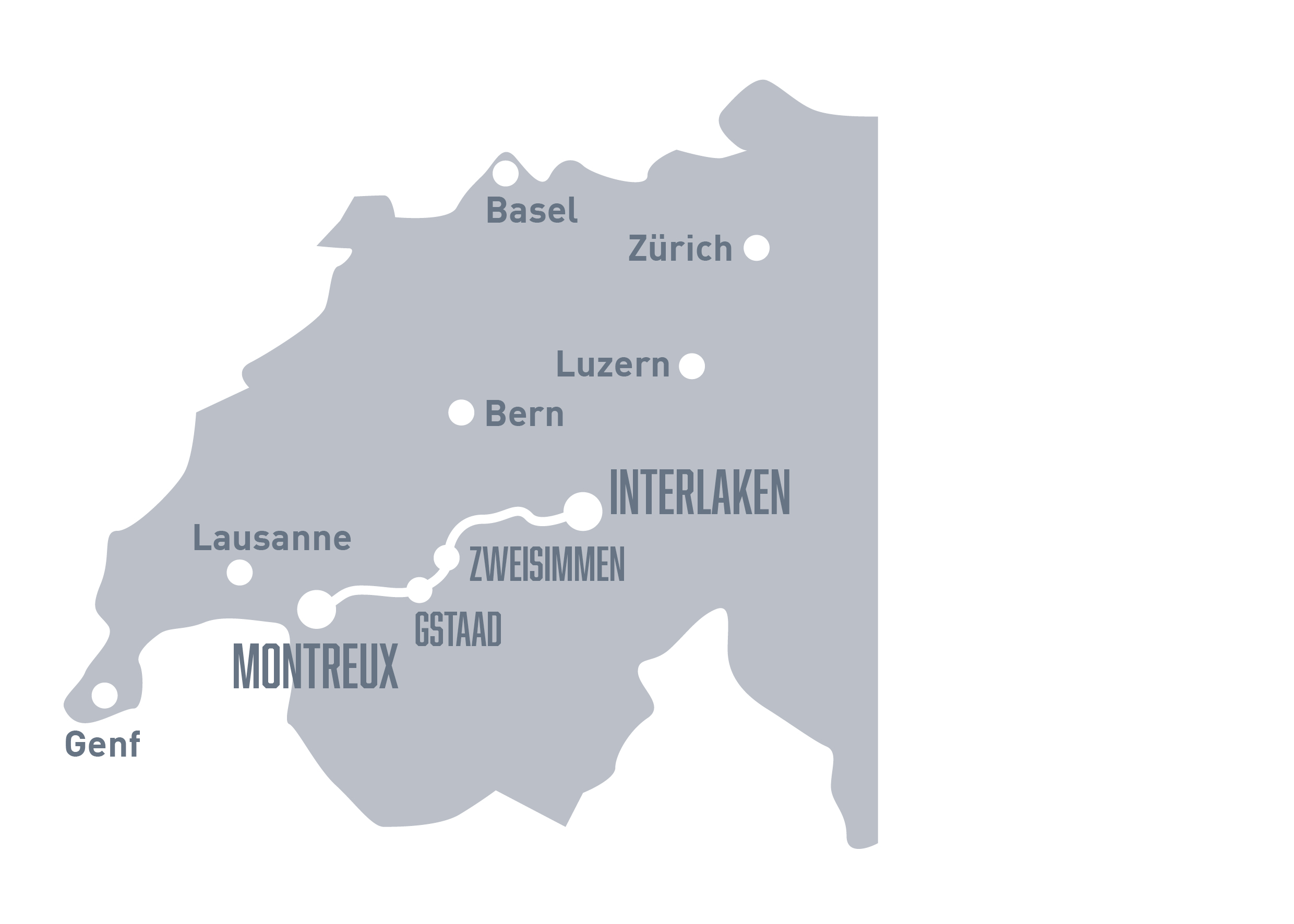 Pünktlich um 9.33 Uhr verlässt der GoldenPass Express den Bahnhof Montreux, zieht seine blau-weisse Spur durch die Postkartenlandschaft, vorbei an kristallklaren Seen, Wäldern und Bergen, tief verschneit im Winter, saftig grün im Sommer. Zunächst fährt der Zug hoch über dem Genfersee, bevor er nach ein paar eleganten Kurven ins Tal abtaucht, sich durch das Greyerzerland schlängelt und das malerische Pays-d’Enhaut passiert. Schöner geht’s kaum, das fanden auch Roger Federer und Trevor Noah, als sie ohne Ticket und Geld im vermeintlich falschen Zug landeten…