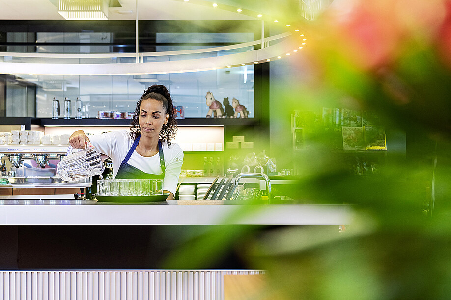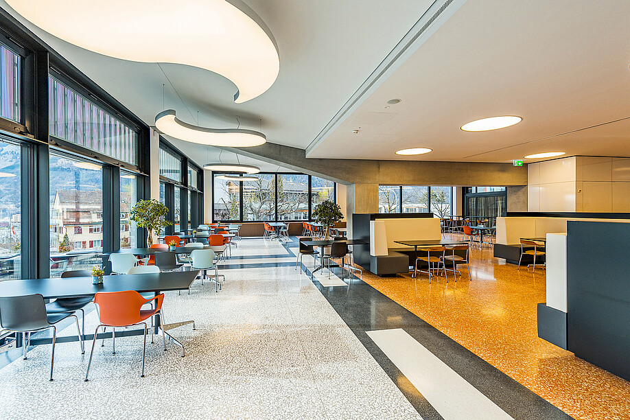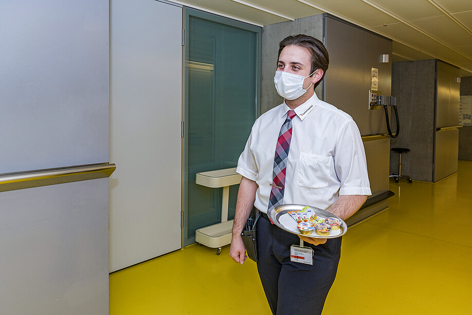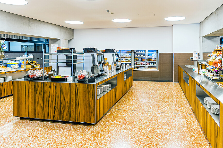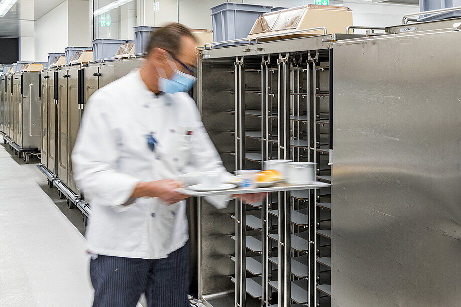 Im März 2020 wurde ein erster Teil des neuen Hauptgebäudes in Betrieb genommen, darunter die neuen Gastronomie-Bereiche. Gleich beim Eingang heisst die Kaffi Box die Gäste willkommen. Hier geniesst man aromatischen Kaffee und feine Snacks — auch zum Mitnehmen. Im ersten Stock ist das öffentliche Restaurant H untergebracht — mit rund 400 Sitzplätzen und einem attraktiven Freeflow-Bereich mit kalten und warmen Buffets sowie offenen Kochstationen. Gleich dahinter befindet sich eine grosse und top-effizient ausgestattete Produktionsküche. Denn mit dem Neubau wurde auch ein neues Verpflegungskonzept umgesetzt. «Vorher hatten wir drei autonome Küchen in Betrieb, jetzt wird von einem Standort aus geplant, bestellt, vorproduziert und ausgeliefert», erklärt Marcel Coray, Bereichsleiter Hotellerie & Service, gegenüber GOURMET. Aktuell werden in der Produktionsküche 2000 Hauptmahlzeiten zubereitet, davon 1000 Mittagessen. Aber nicht nur für Patientinnen und Gäste des Spitals, sondern auch für externe Betriebe. Dazu Marcel Coray: «Wir haben das Potenzial der neuen Küche erkannt und wollen dieses auch optimal ausschöpfen.» Effizienter werden statt Personal abbauen – das war letztlich auch die